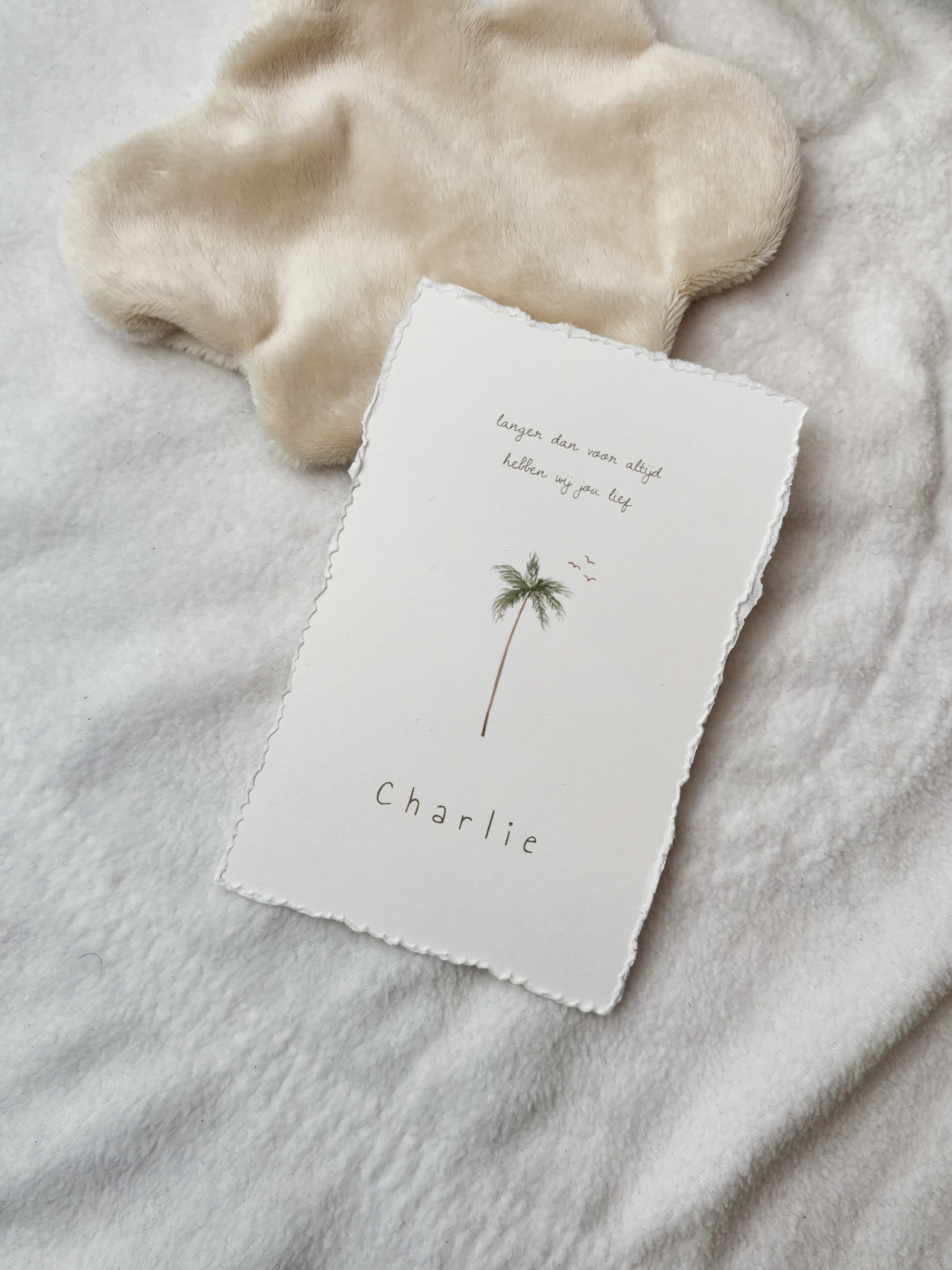 Lief geboortekaartje met handgeschepte look met aquarel palmboom en vogels in de lucht.