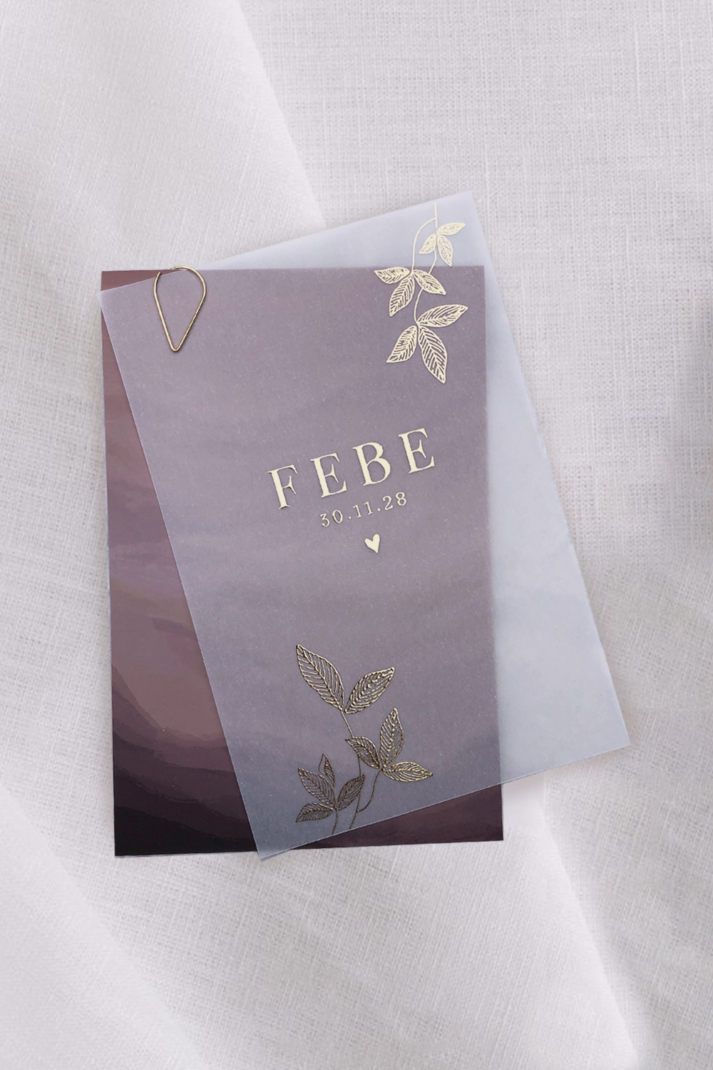 Kalkpapier geboortekaartje met naam en bladeren in goudfolie. Let op: dit is een semi-transparant geboortekaartje. De voorste kaart is afgedrukt op 150 gram kalkpapier en bedrukt met gouden folie. Voor de achterste kaart en de paperclip moet je afzonderlijke bewerkingen en bestellingen uitvoeren.