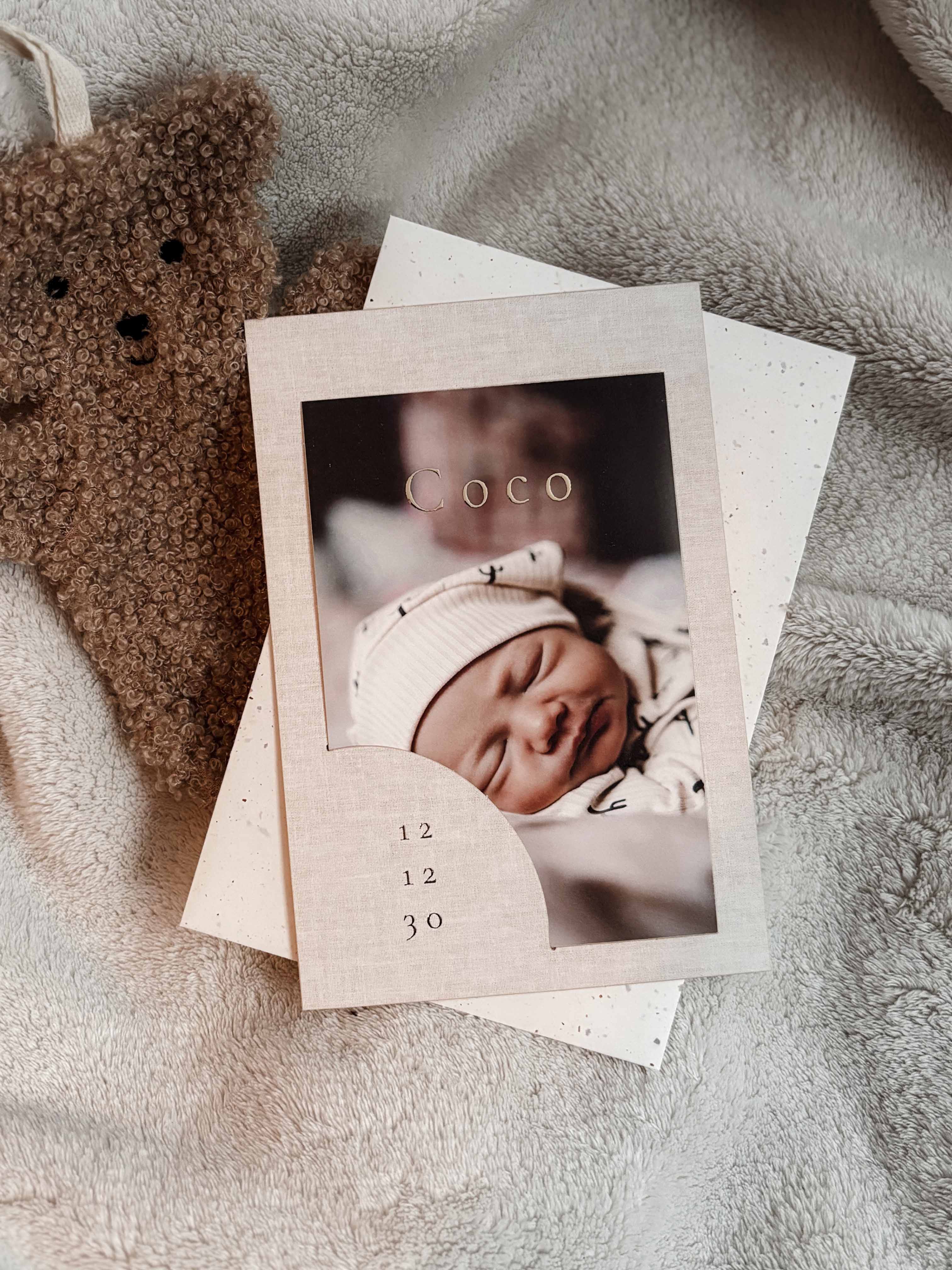 Een uniek insteek geboortekaartje met een mooie linnenlook en foto. Tip: druk deze kaart af op linnen papier voor een extra mooi effect van het linnen! Heb je hulp nodig met opmaken? Wij helpen je graag!