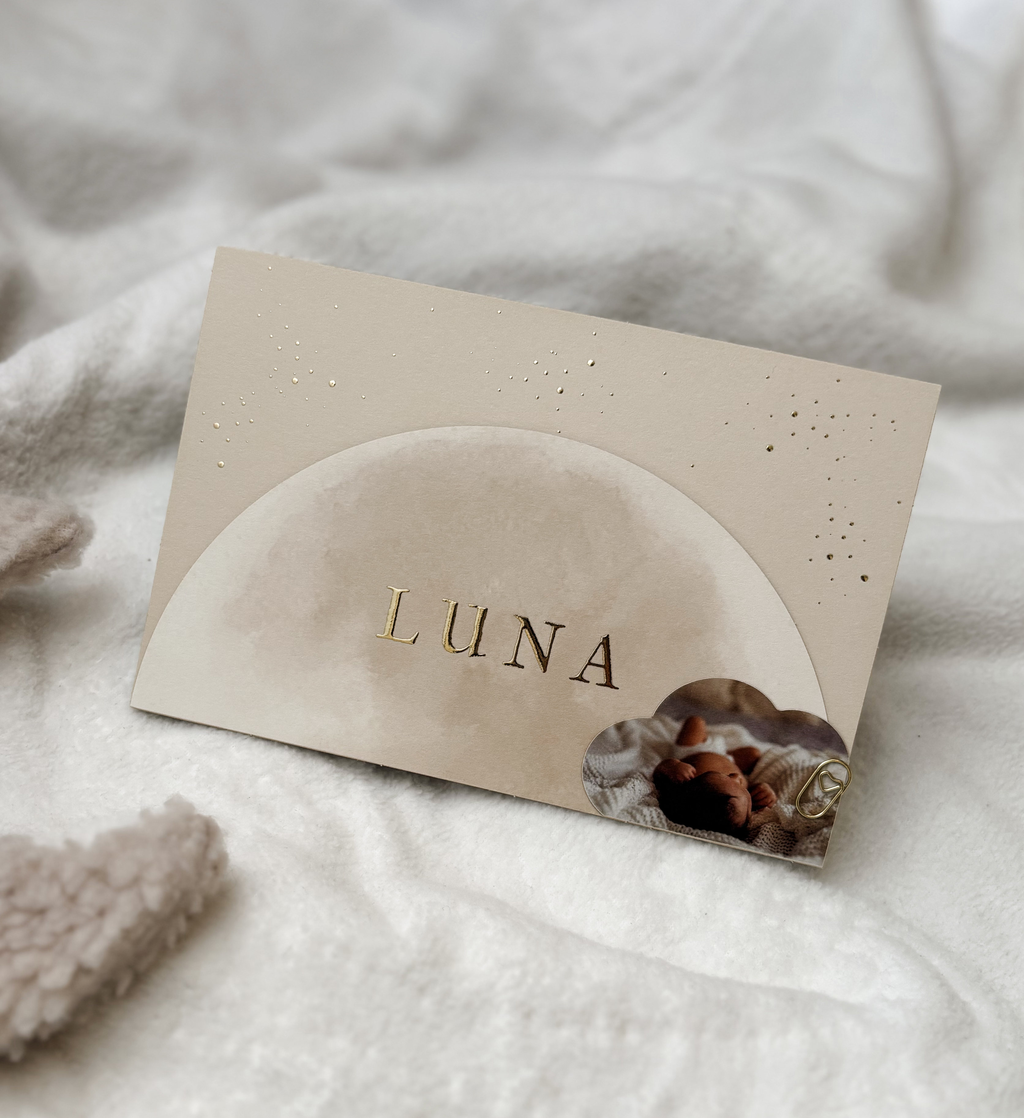 Geboortekaartje labelkaart uniek maan sterrenhemel folie