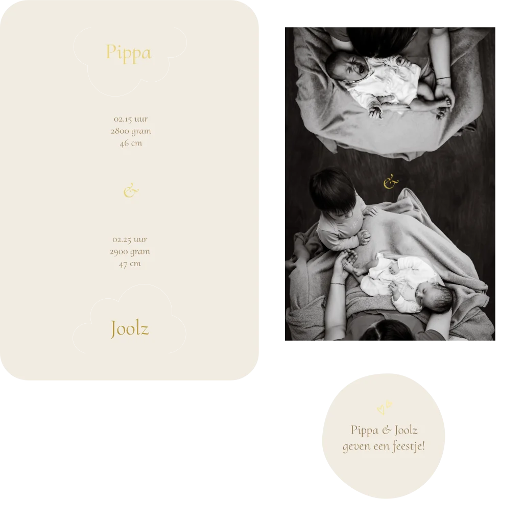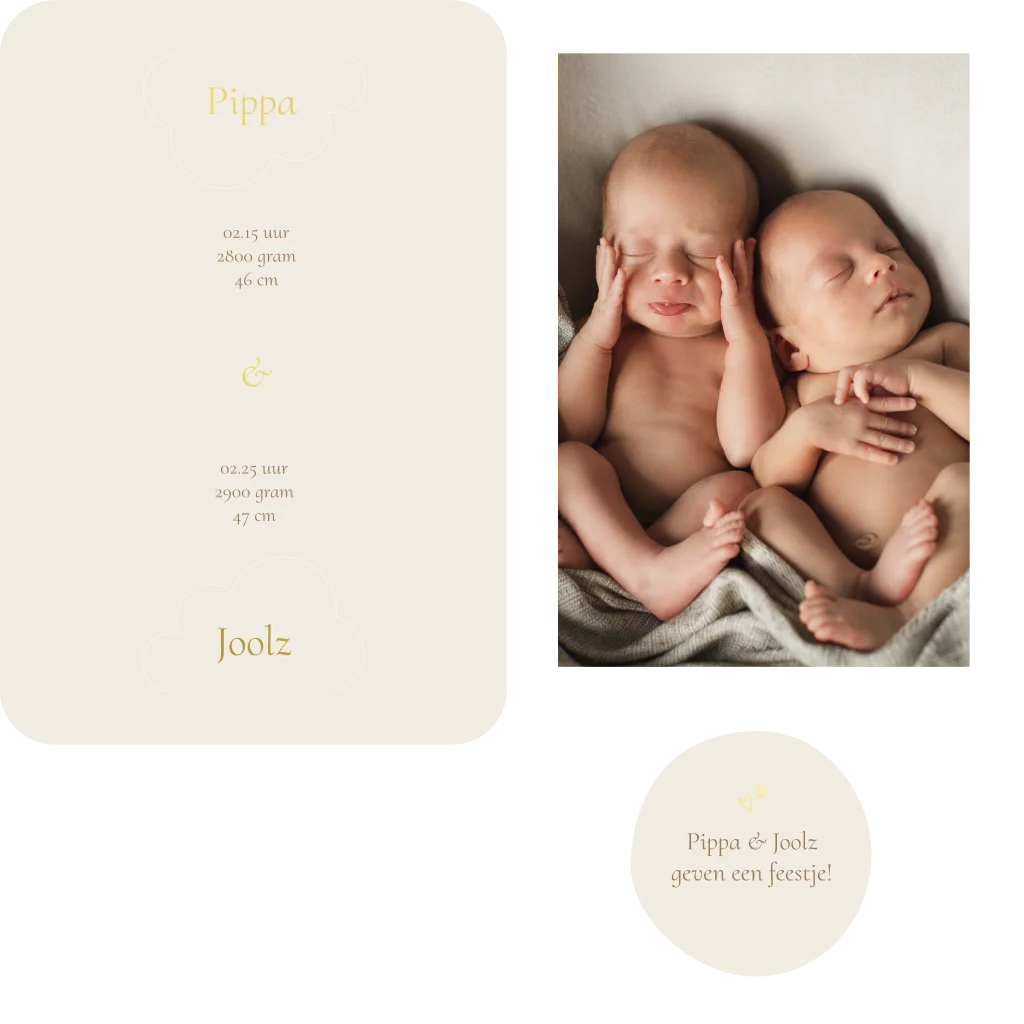 Dit unieke label tweeling geboortekaartje bestaat uit 3 delen; het fotokaartje, een inschuifkaartje waarbij de wolkjes het fotokaartje vasthouden en een kraamborrelkaartje in de vorm van een maantje die je ook achter een wolk schuift. Pas alles geheel naar wens aan en zet gemakkelijk een foto van jullie kindjes erop. Let op: je krijgt 3 lossen kaartjes aangeleverd en je moet ze zelf nog in elkaar schuiven thuis. Heb je hulp nodig met opmaken of heb je vragen - stuur ons een berichtje, we helpen je graag!