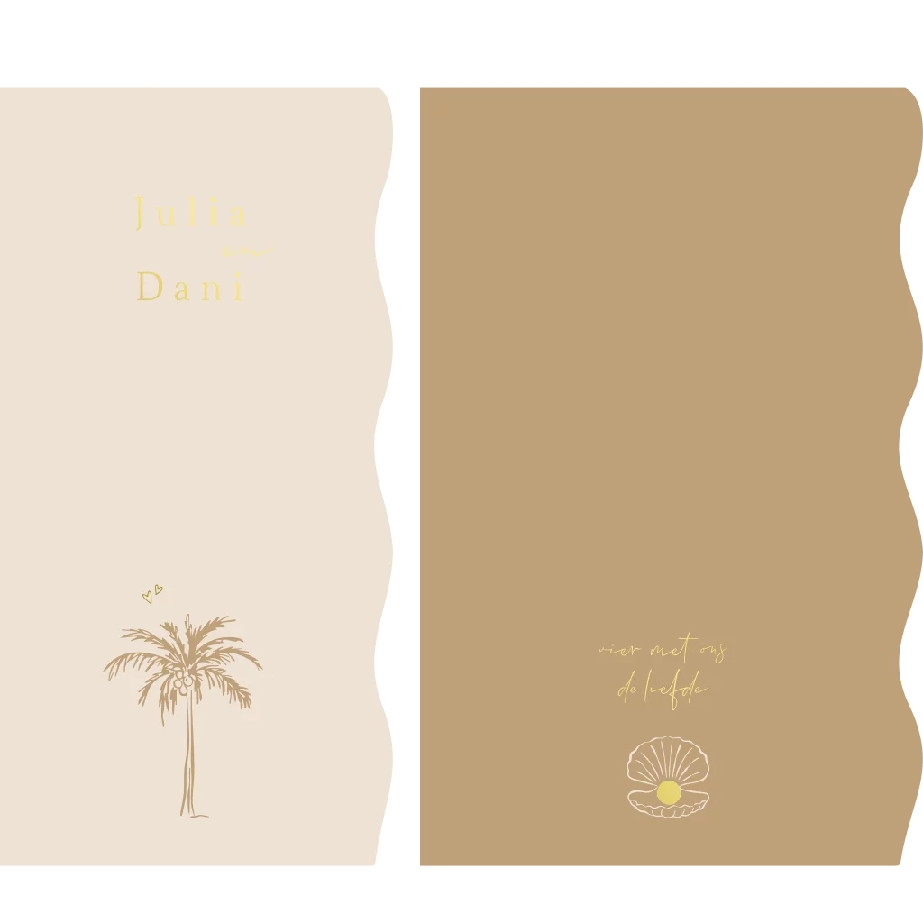 Een moderne trouw labelkaart (of stapelkaart) met een beach zeethema. Je legt de ene kaart over de ander heen en maakt het vast met een mooie gouden paperclip (ook in hartjes verkrijgbaar). Heb je hulp nodig met opmaken? Wij helpen je graag!