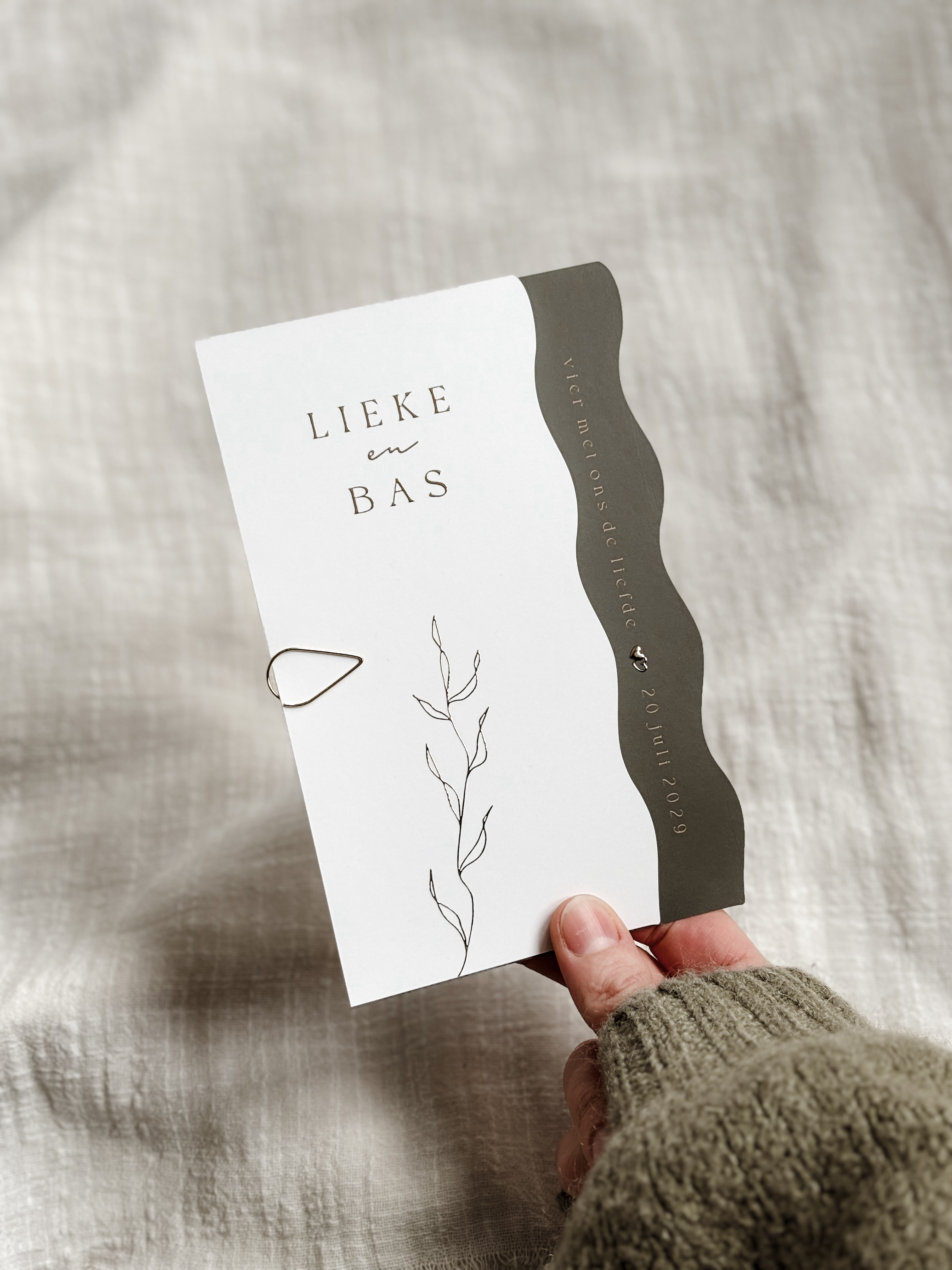 Een moderne trouw labelkaart (of stapelkaart). Je legt de ene kaart over de ander heen en maakt het vast met een mooie gouden paperclip (ook in hartjes verkrijgbaar). Heb je hulp nodig met opmaken? Wij helpen je graag!