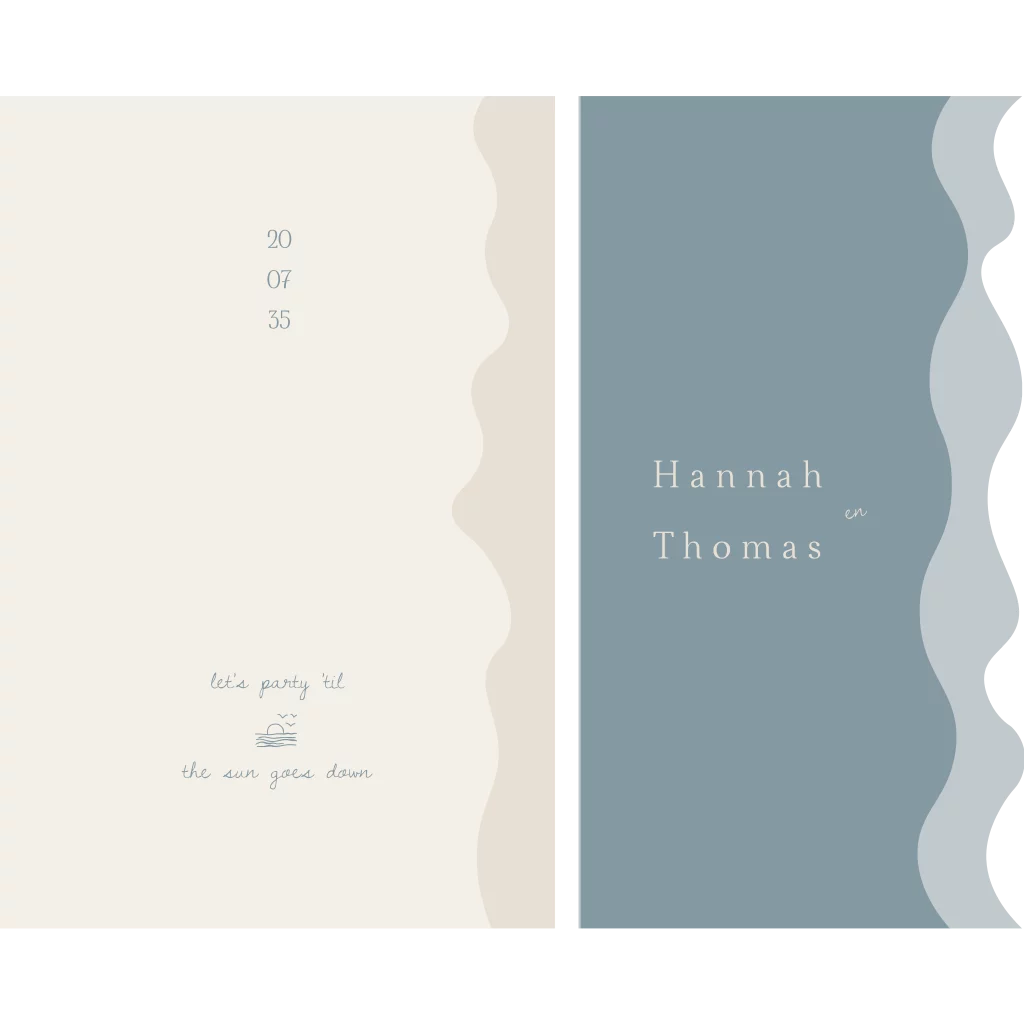 Mooie en unieke trouwkaart met de golven van de zee, voor een mooie zeethema beachwedding thema. Pas de kleuren, gegevens en/of icoontjes gemakkelijk aan. Voor hulp staan wij altijd voor je klaar!
