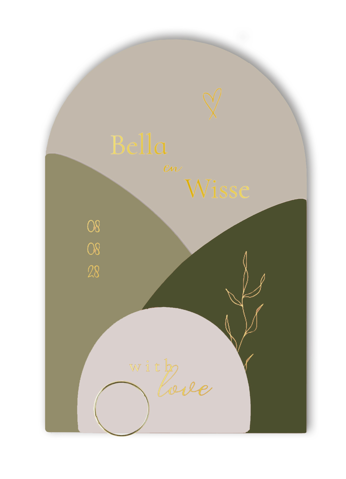 Unieke vorm trouwkaart stapelkaart labelkaart warm goudfolie details