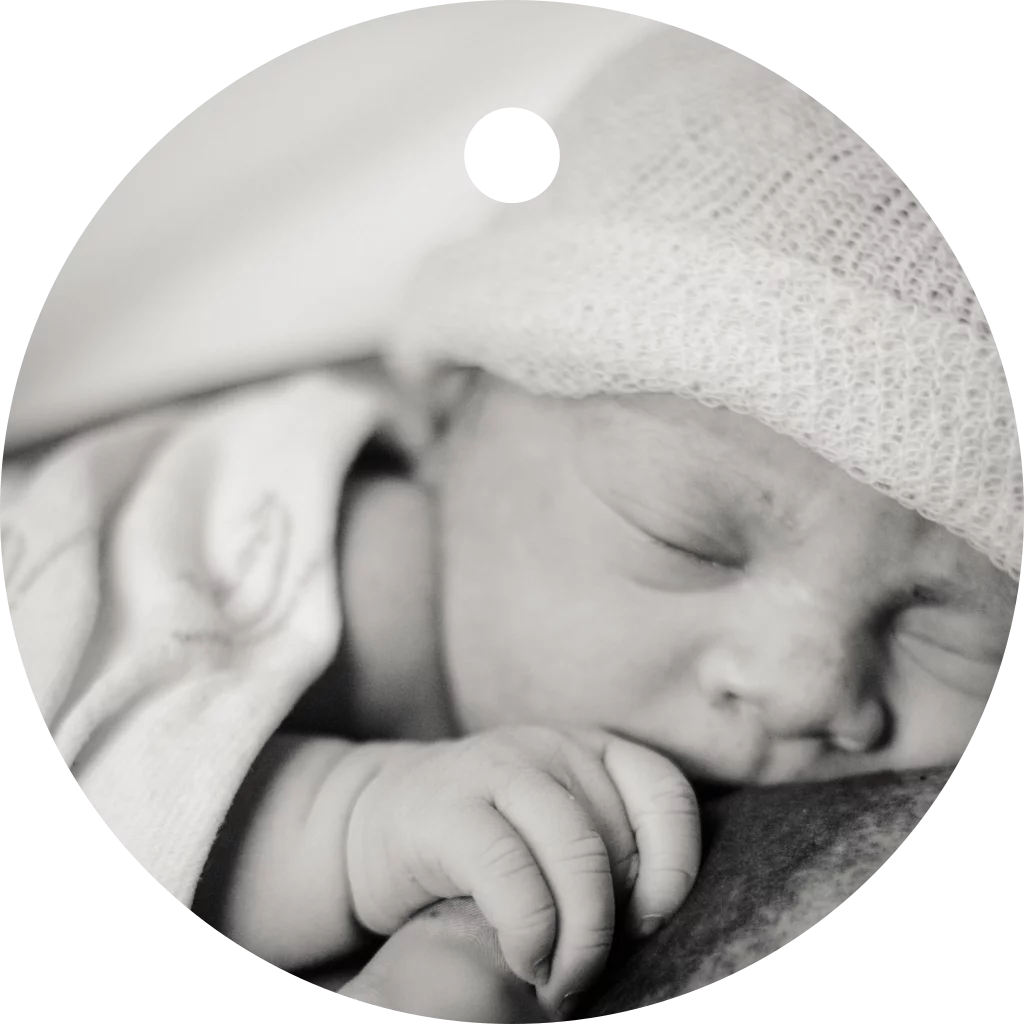Een rond fotolabeltje met een gaatje, bevestig het met een touwtje aan het geboortekaartje. De labeltjes hebben een diameter van 40mm.