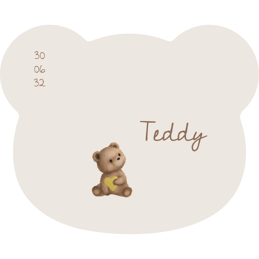 Stoer en uniek geboortekaartje in de vorm van een berenhoofd met een lief knuffelbeertje die een gouden hartje vasthoud. Liever andere kleuren of folie? Pas het gemakkelijk aan in de handige editor!