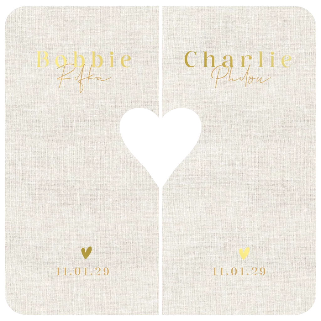Bijzonder tweeling geboortekaartje met uitsnede hart verbonden. De namen zijn afgewerkt met goudfolie en de achtergrond heeft een linnen-look. De 2 kaartjes passen samen in 1 envelop. TIP: print deze kaartjes uit op Linnen papier.