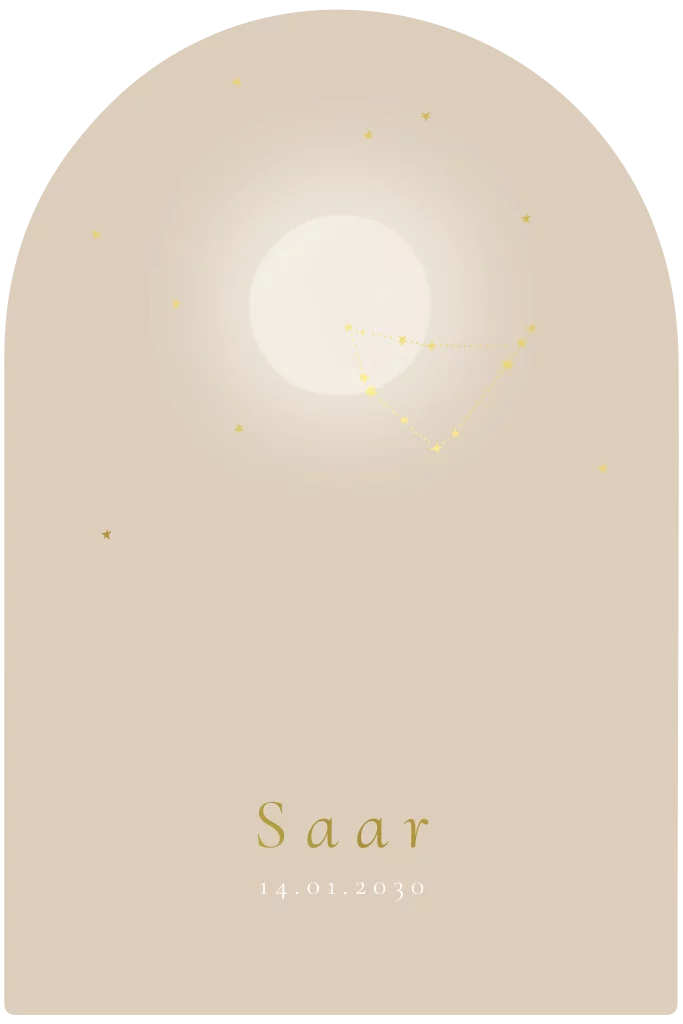 Boogvorm geboortekaartje donker beige maan sterrenbeeld goudfolie