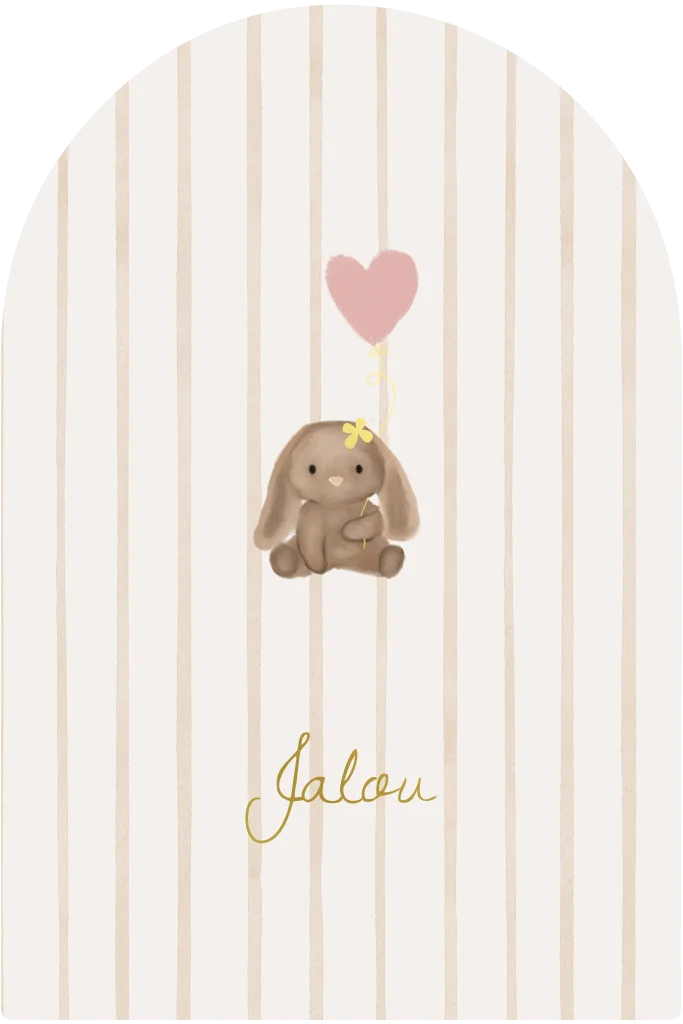 Heel gaaf, dit lieve minimalistische geboortekaartje in boogvorm met een illustratie van een aquarel knuffelkonijntje en hartjesballon met als touwtje in folie gedrukt. Pas gemakkelijk de kleur folie, achtergrond en/of hartje naar wens en smaak aan, heb je hulp nodig of vragen - wij helpen je graag!
