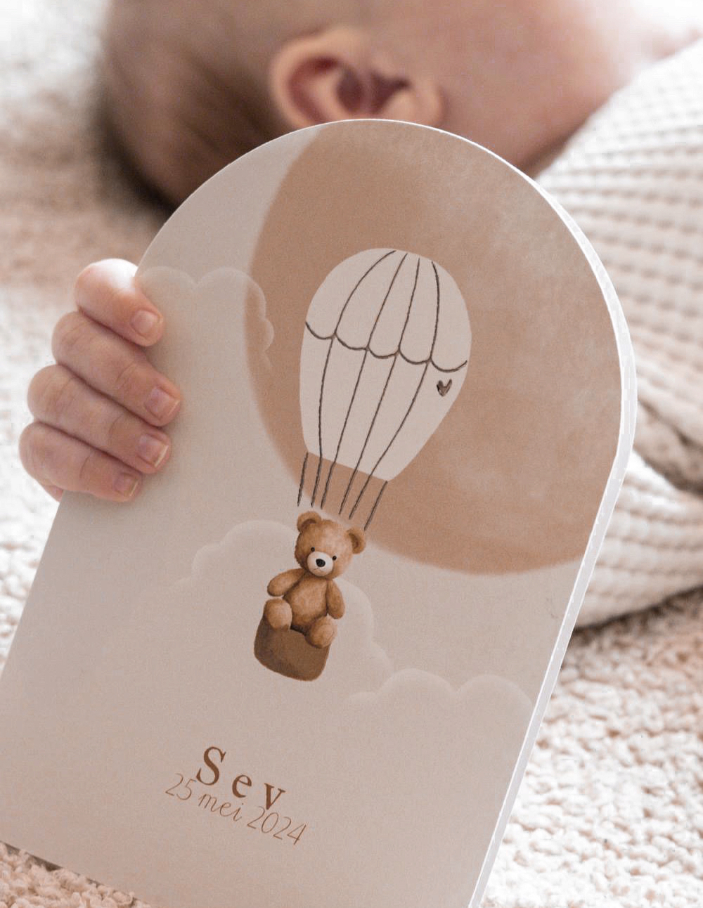 Lief geboortekaartje in een boogvorm met een luchtballon en knuffelbeertje in de wolken met volle maan en goudfolie details. Heb je hulp nodig met opmaak van het kaartje? Wij helpen je graag!