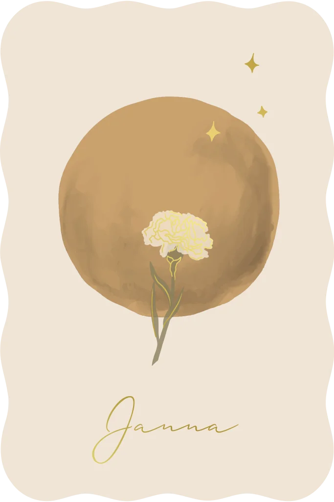 Een echt geboortebloem geboortekaartje met een januaribloem, de anjer (je kunt de de bloem in elke kleur zetten die je wilt) met als achtergrond een volle maan. De babynaam, lijntjes van de bloem en sterren worden gedrukt in goudfolie.