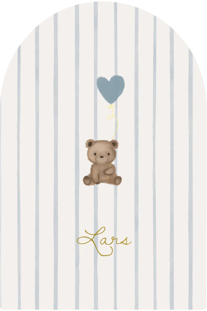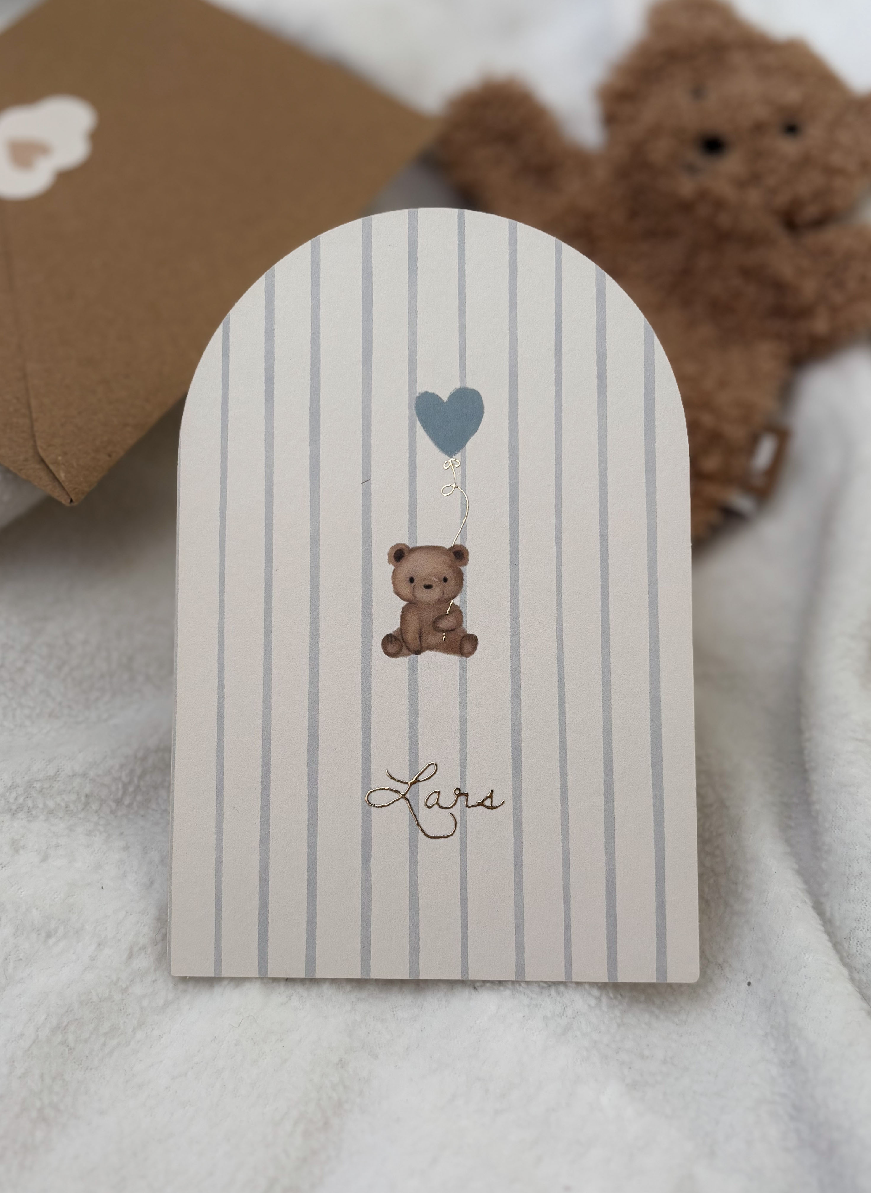 Heel gaaf, dit lieve minimalistische geboortekaartje in boogvorm met een illustratie van een aquarel knuffelbeertje en hartjesballon met als touwtje in folie gedrukt. Pas gemakkelijk de kleur folie, achtergrond en/of hartje naar wens en smaak aan, heb je hulp nodig of vragen - wij helpen je graag!