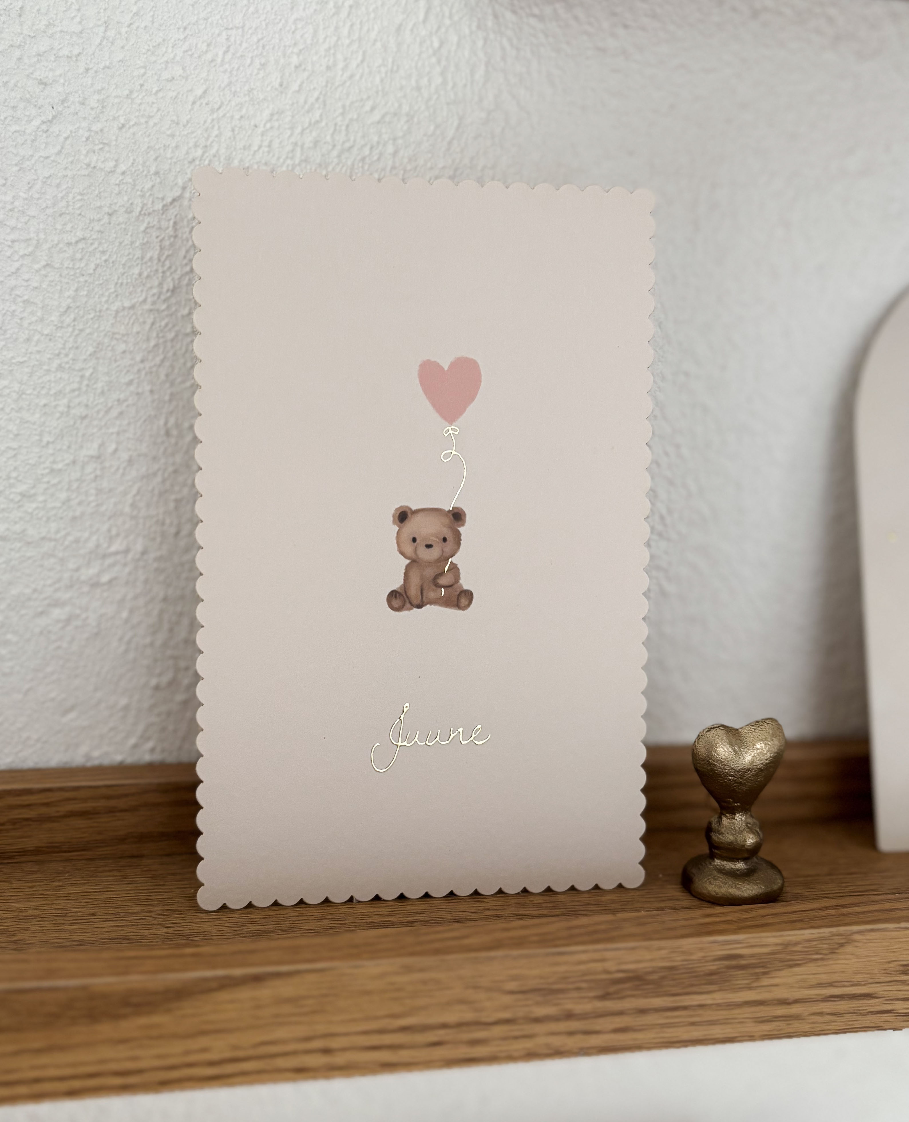 Heel gaaf, dit lieve minimalistische geboortekaartje met minigolfjes aan de rand met een illustratie van een aquarel knuffelbeertje en hartjesballon met als touwtje in folie gedrukt. Pas gemakkelijk de kleur folie, achtergrond en/of hartje naar wens en smaak aan, heb je hulp nodig of vragen - wij helpen je graag!