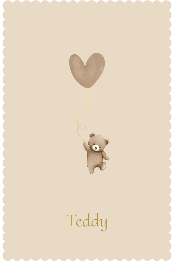 Heel gaaf, dit originele minimalistische geboortekaartje met minigolfjes aan de rand met een illustratie van een aquarel hartjesballon met als touwtje in folie gedrukt en daaraan een aqaurel lief knuffelbeertje. Pas gemakkelijk de kleur folie en/of achtergrond naar wens en smaak aan, heb je hulp nodig of vragen - wij helpen je graag!