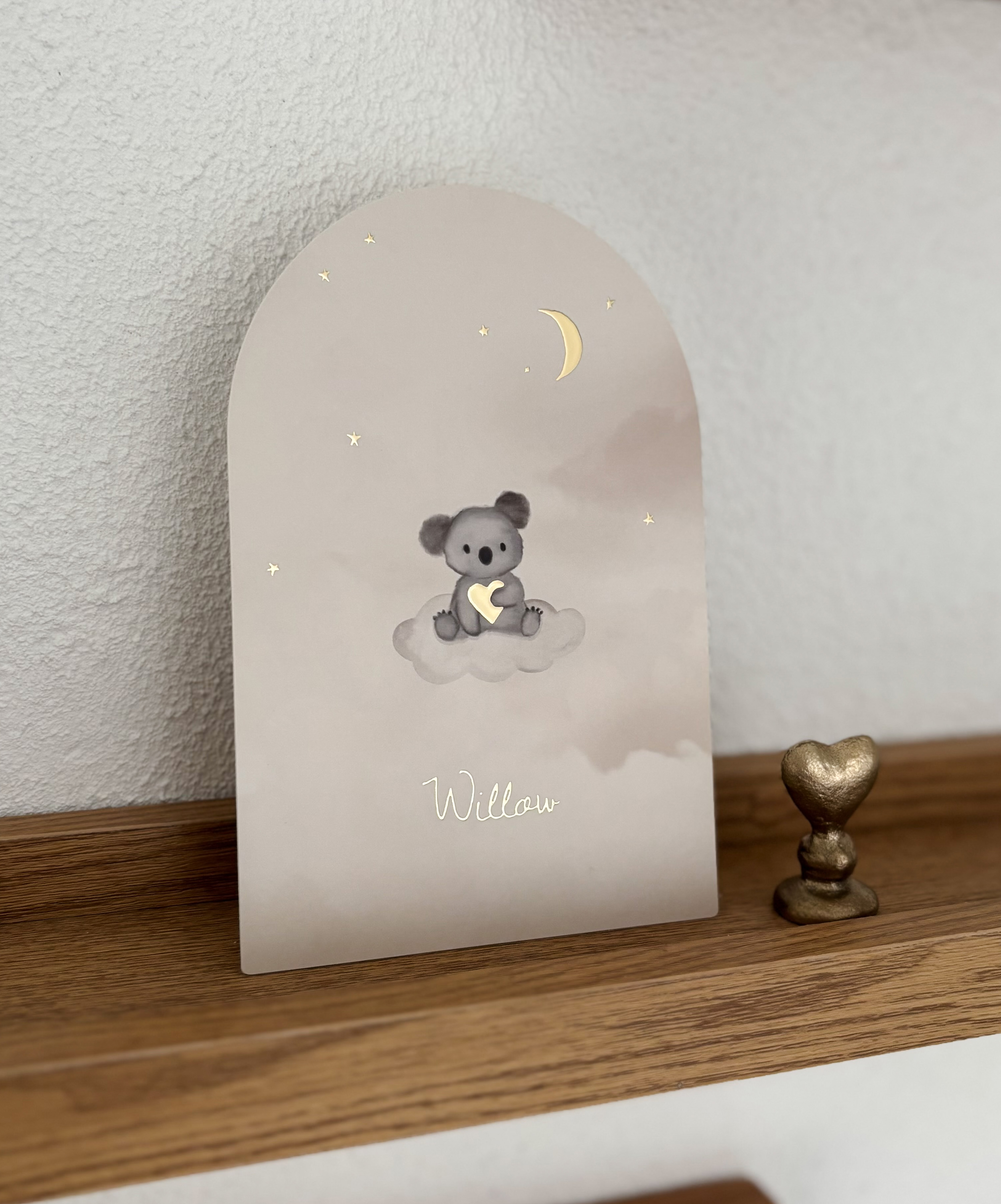 Heel gaaf, dit lieve minimalistische geboortekaartje in boogvorm met een illustratie van een aquarel koalabeertje die een hartje vasthoudt en in de wolken zit. Pas gemakkelijk de kleur folie, achtergrond en/of hartje naar wens en smaak aan, heb je hulp nodig of vragen - wij helpen je graag!