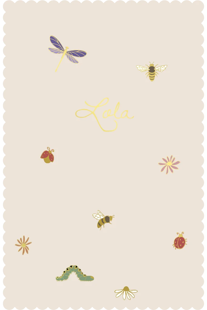 De babynaam en de lijnen van de bijtjes, insecten en bloemetjes worden gedrukt in goudfolie wat een supermooi chique effect geeft! De rand heeft een golfje voor een extra speelsheid.