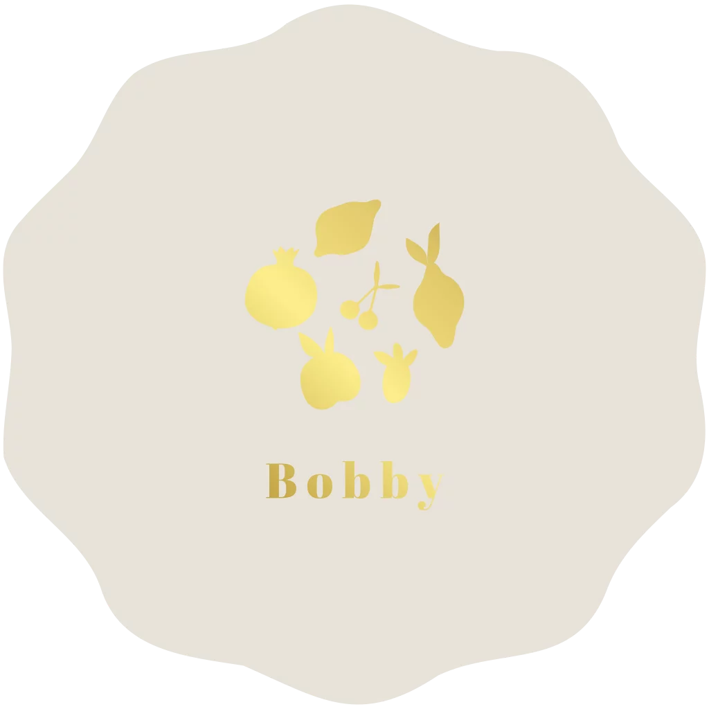 Geboortekaartje in bijzondere golvende vorm met divers fruit silhouetten die worden gedrukt in koperfolie.
