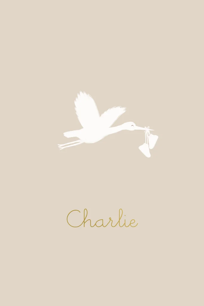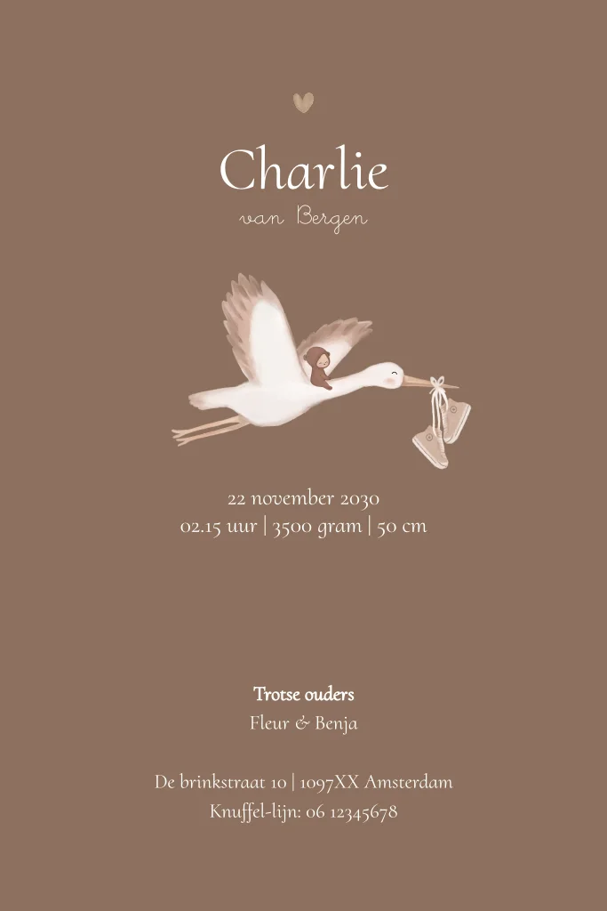 Lief en bijzonder geboortekaartje met een ooievaar waarbij de vleugels worden uitgesneden en je naar voren kunt halen. Pas gemakkelijk zelf de kleuren en/of folie aan in de handige editor. Tip: laat dit kaartje op linnen drukken.