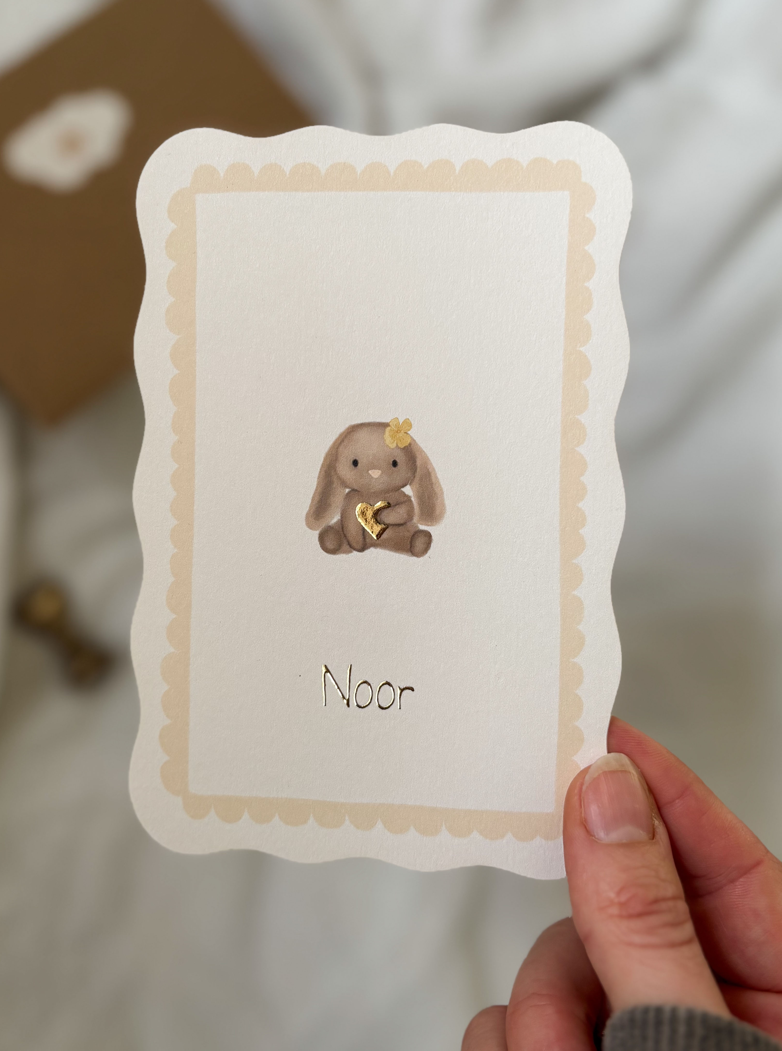 Heel gaaf, dit lieve minimalistische geboortekaartje in golfjesvorm met een illustratie van een aquarel knuffelkonijntje die een rosegoudfolie hartje vasthoudt. Pas gemakkelijk de kleur folie, achtergrond en/of hartje naar wens en smaak aan, heb je hulp nodig of vragen - wij helpen je graag!