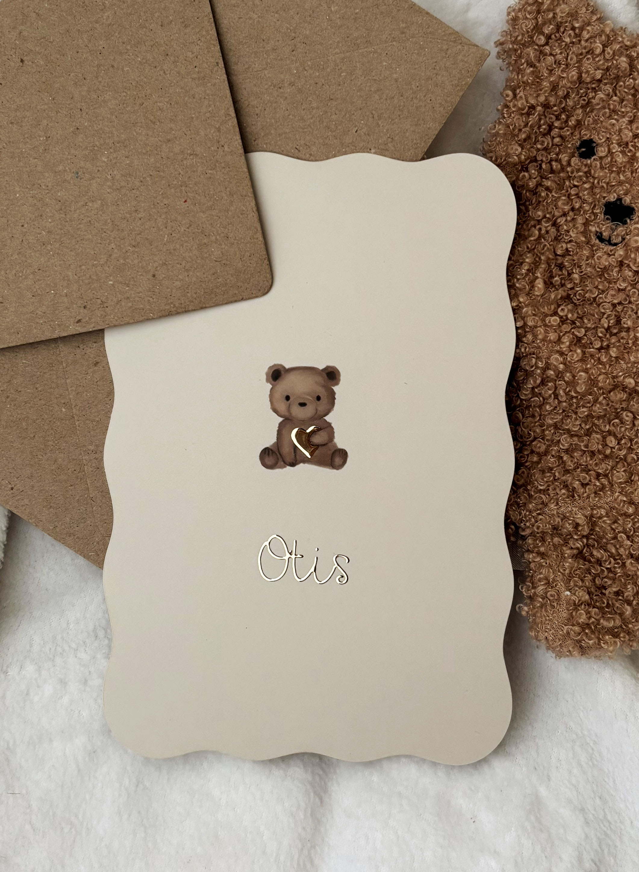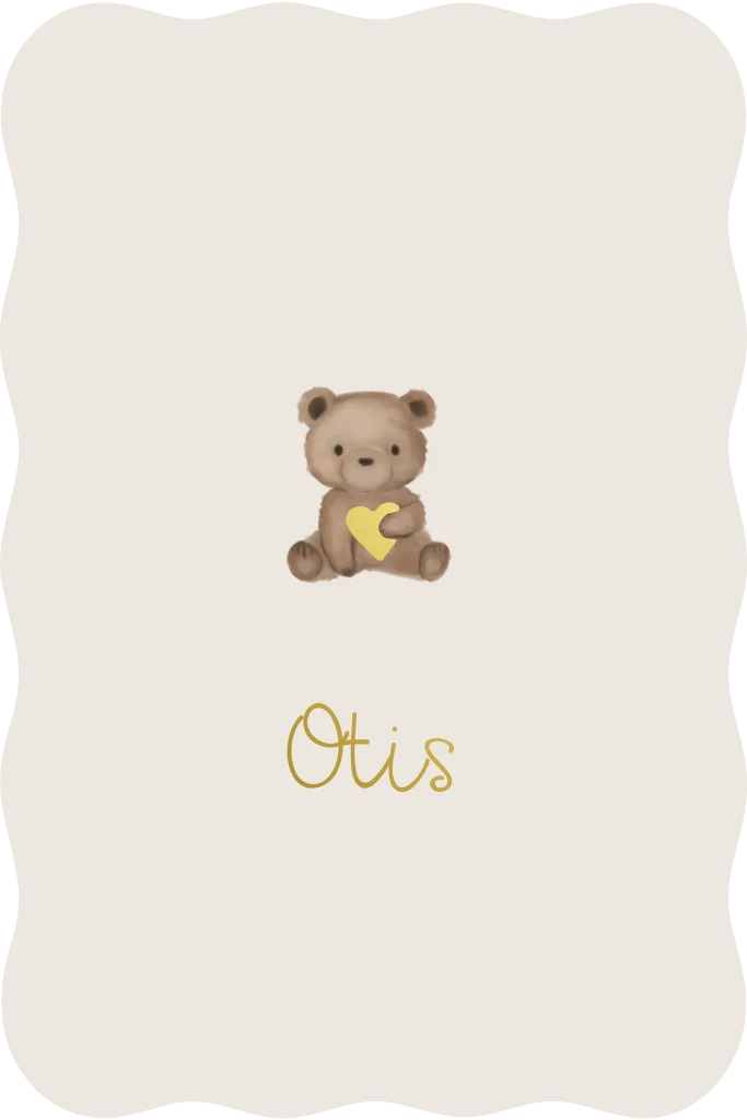 Heel gaaf, dit lieve minimalistische geboortekaartje in golfjesvorm met een illustratie van een aquarel knuffelbeertje die een goudfolie hartje vasthoudt. Pas gemakkelijk de kleur folie, achtergrond en/of hartje naar wens en smaak aan, heb je hulp nodig of vragen - wij helpen je graag!
