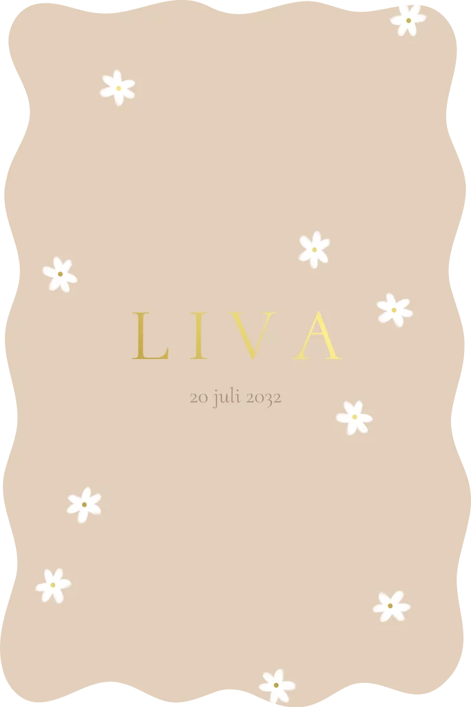 Lief meisjes geboortekaartje in een mooie golfvorm met madeliefjes waarbij de knopjes in folie gedrukt worden. Pas de kleuren en/of gegevens gemakkelijk aan in de handige online editor. Voor hulp, vragen of silhouetten die je niet terug kunt vinden in de editor, kun je altijd een berichtje sturen - wij helpen je graag!