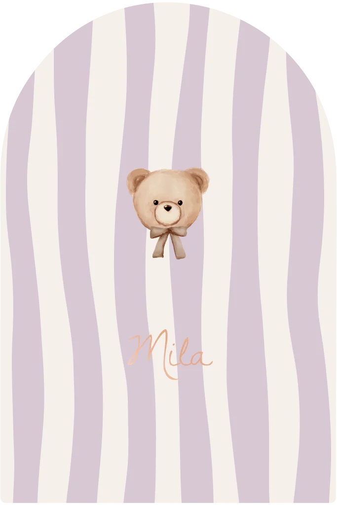 Geboortekaartje boogvorm met een knuffelbeertje met strikje met een hip trendy streepjes achtergrond die je in elke favoriete kleur kunt zetten die je wilt. Liever een dubbele kaart of een andere vorm kaart of heb je hulp nodig met opmaken? Stuur een berichtje, wij helpen je graag verder!