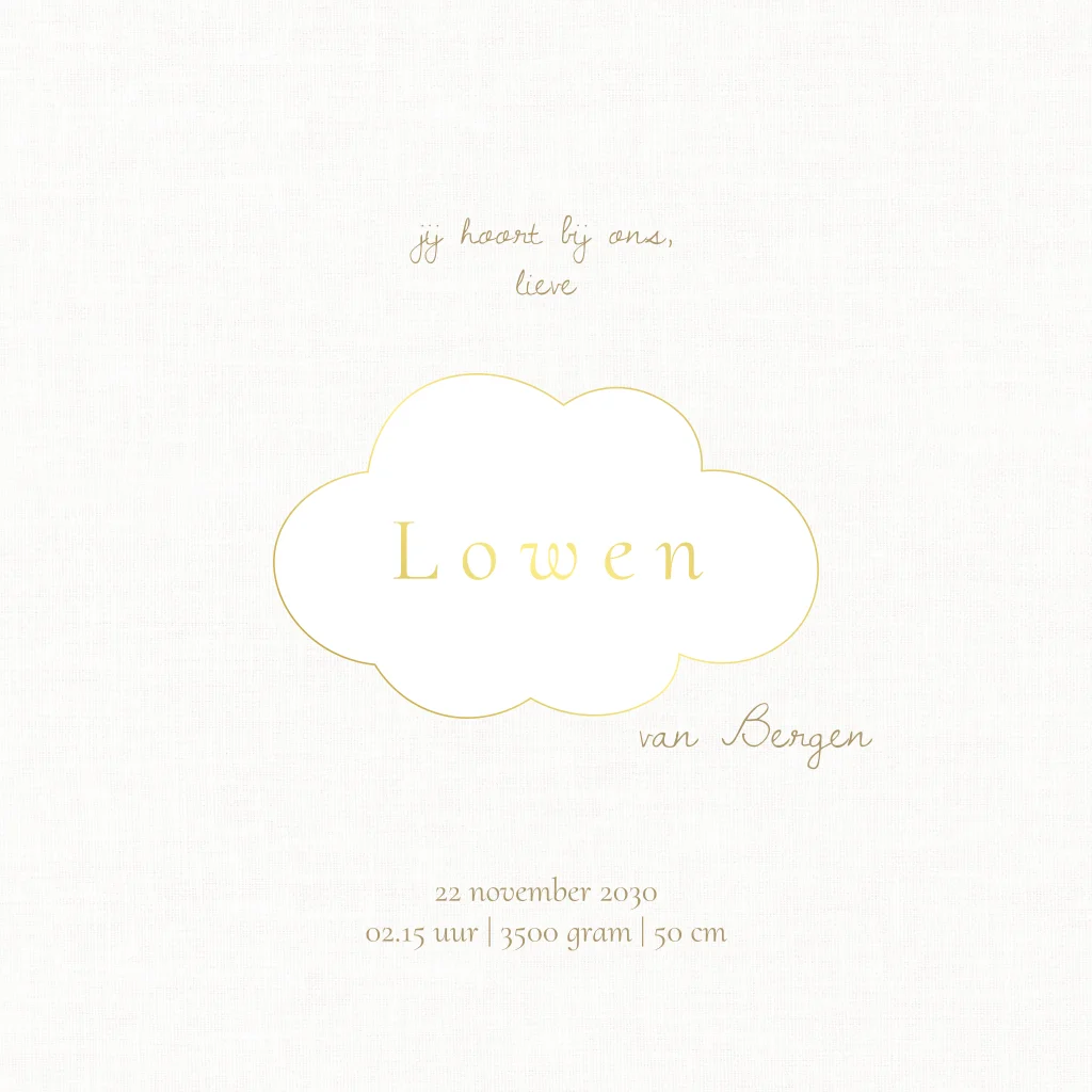 Stoer en minimalistisch geboortekaartje met een uitsnede van een wolkje in het midden van de kaart. Aan de binnenkant van de kaart is de naam in folie en de omlijning van de wolk. Pas gemakkelijk de kleuren aan in de editor. Kom je er niet uit, heb je vragen of wil je de kaart in een andere vorm/formaat/enkele kaart? Stuur ons dan een berichtje, wij helpen je graag!