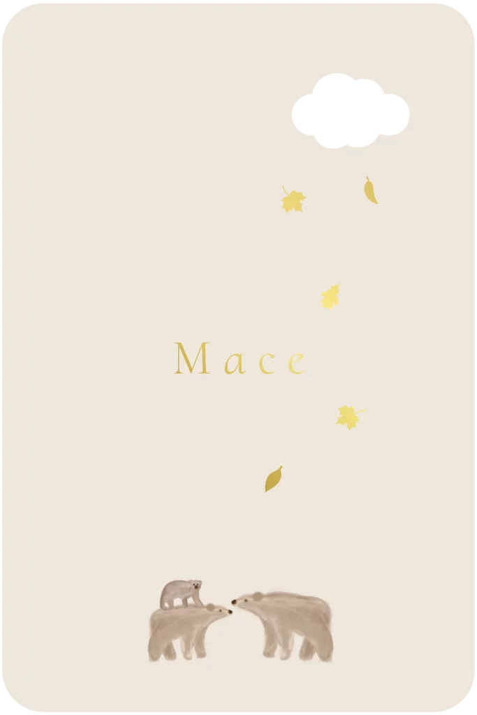 Lief herfst geboortekaartje met ronde hoeken en een uitgesneden wolkje met een aqaurel berenfamilie in beige kleuren met goudfolie.