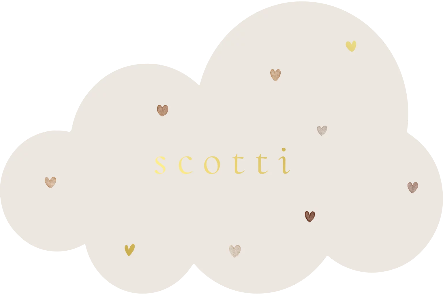 Lief geboortekaartje in een wolkvorm met waterverg beige zandkleurige hartjes. Een paar folie hartjes voor de details. Liever andere kleuren? Pas het gemakkelijk aan in de handige editor. Kom je er niet uit of heb je vragen, wij helpen je altijd graag!