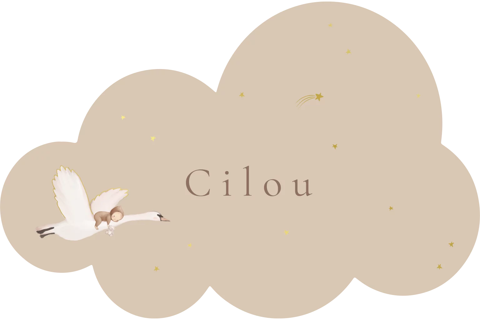 Lief geboortekaartje in een wolkvorm een vliegende zwaan met een slapende baby met knuffelbeertje op zijn rug. Sterretjes, een vallende ster en de lijnen van de vleugels van de zwaan worden gedrukt in goudfolie. Liever andere kleuren? Pas het gemakkelijk aan in de handige editor. Kom je er niet uit of heb je vragen, wij helpen je altijd graag!