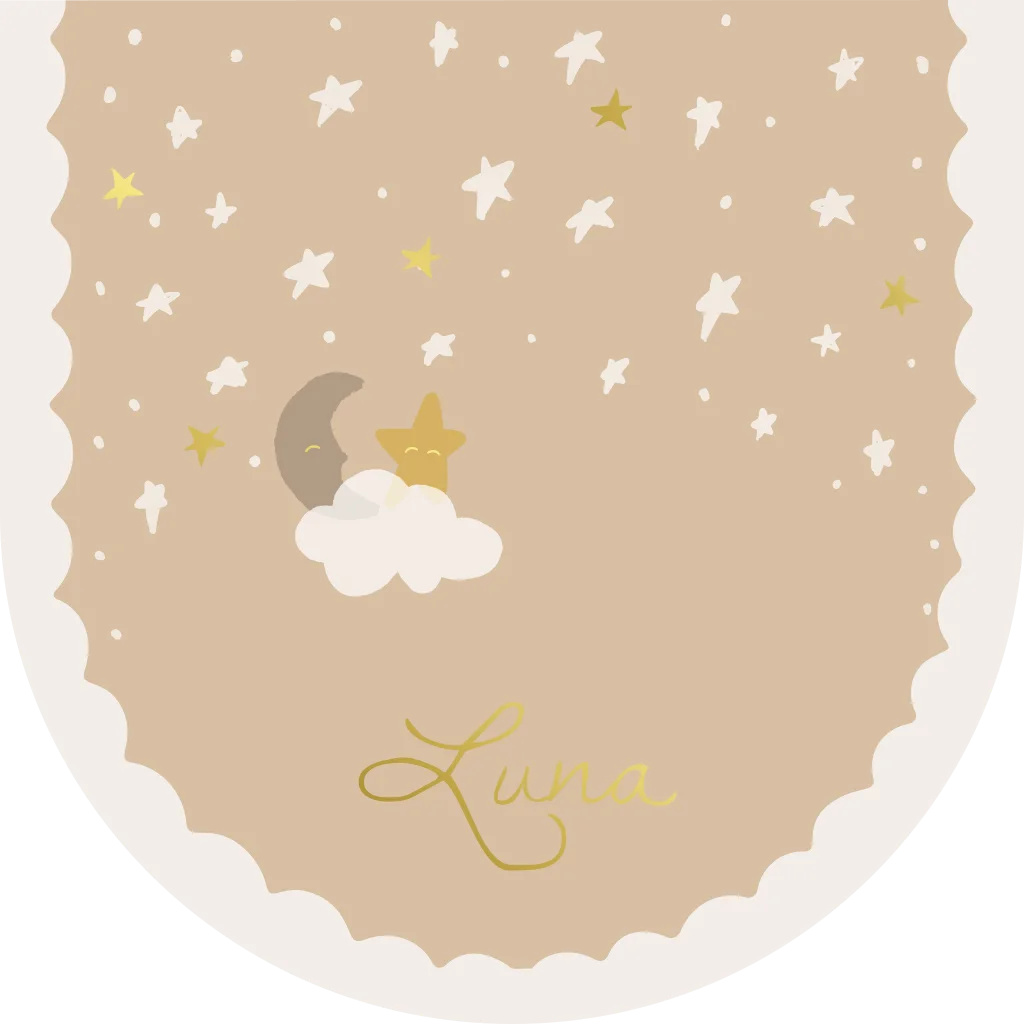 Lief en origineel geboortekaartje in een omgekeerde boogvorm die je zo neer kunt zetten. Leuk met een sterrenhemel en maan en sterren in de wolken.