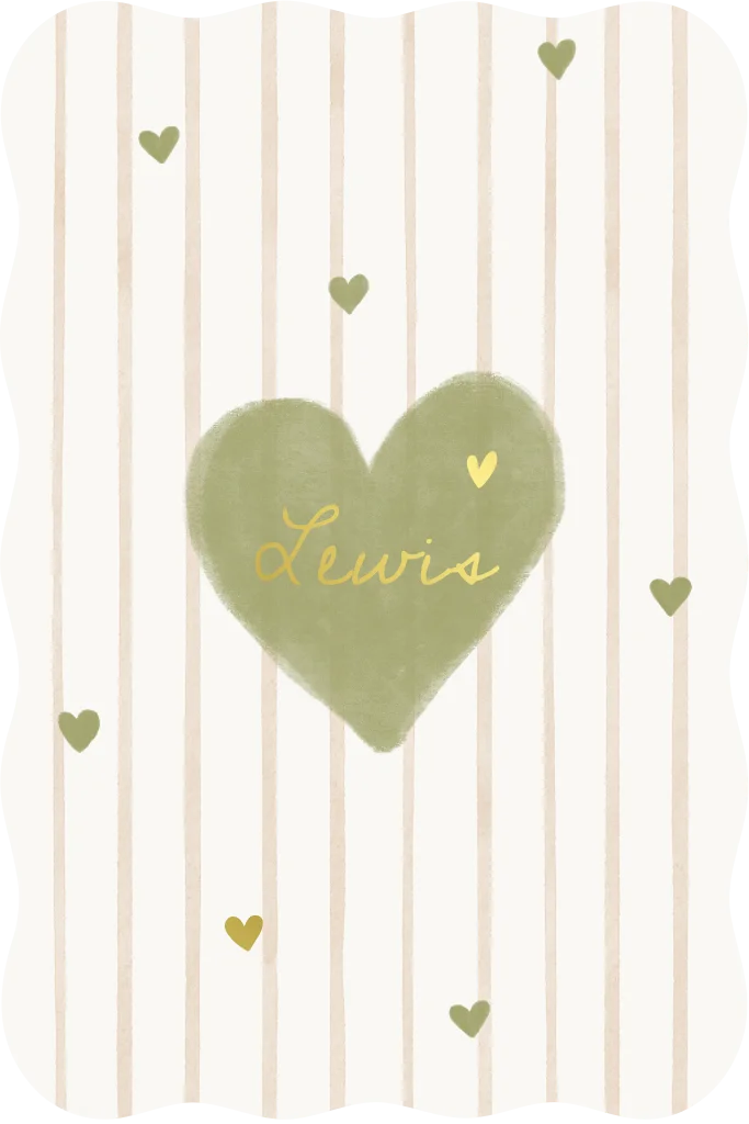 Golfvorm geboortekaartje streepjes hartjes groen goudfolie naam