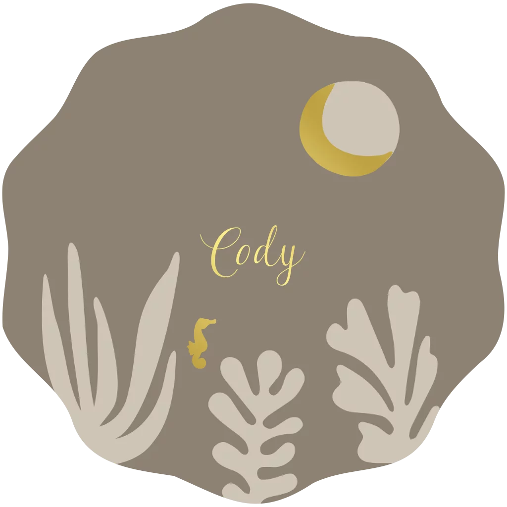 Dit geboortekaartje komt uit de collectie Happy Colors en heeft een unieke vorm. Het onderwaterthema past precies bij de vorm van het kaartje. De maan, het zeepaardje en babynaam worden gedrukt in koperfolie.
