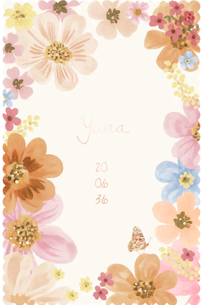 Prachtig kleurrijk handgetekende bloemen geboortekaartje voor een meisje met een gesneden golfjesrand. Pas gemakkelijk gegevens en/of achtergrond aan in de online editor. Heb je hulp nodig of wil je dit geboortekaartje in een andere vorm of dubbele kaart? Stuur ons een berichtje en wij helpen je graag verder.