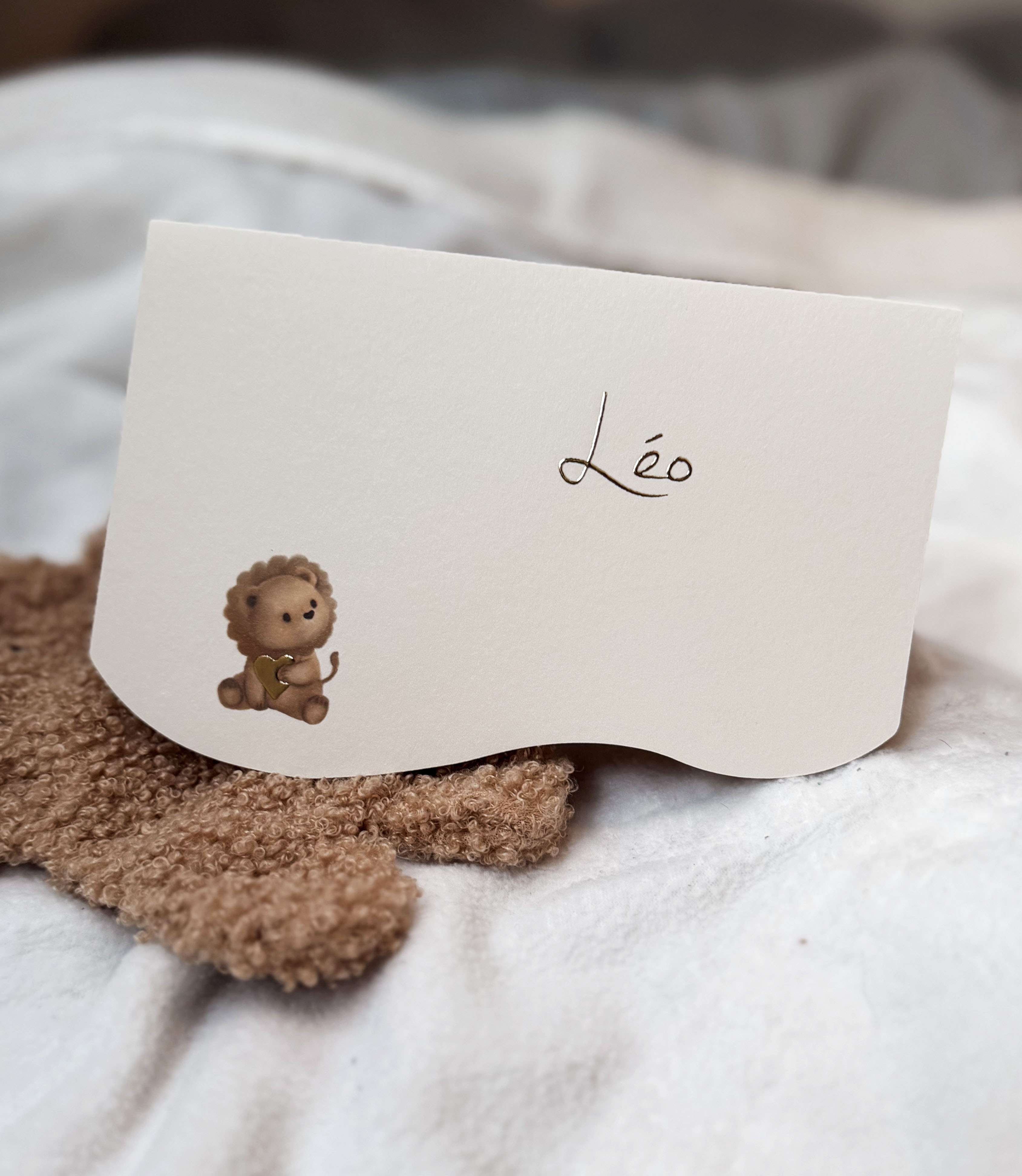 Liggend geboortekaartje golfvorm knuffel leeuwtje hartje in hand folie