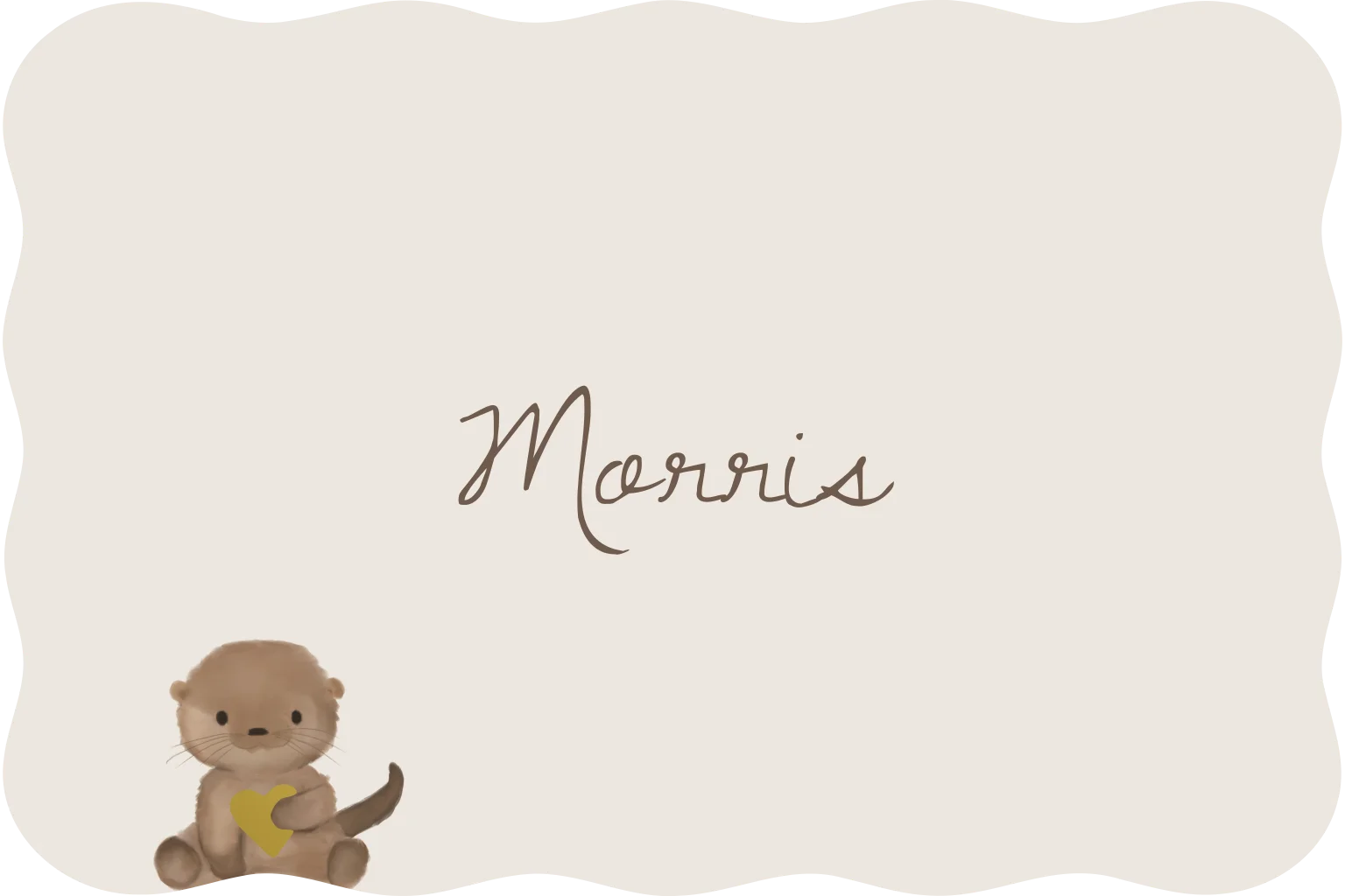 Lief geboortekaartje in een golvende vorm met een lief aquarel getekend ottertje met een goudfolie hartje in zijn/haar hand. Pas de kleuren gemakkelijk aan in de handige online editor. Kom je er niet uit of wil je dit ontwerp in een andere vorm? Laat het ons weten en wij passen het gratis voor je aan in je account!