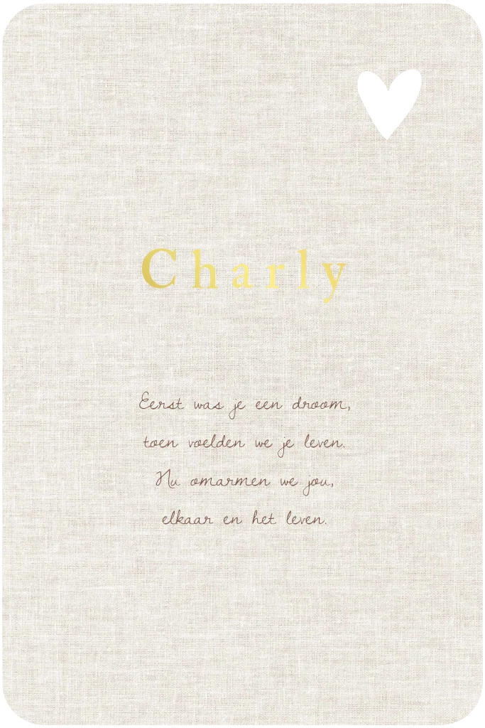 Minimalistisch geboortekaartje met een hartje uitsnede voor zowel een meisje als jongen met linnenlook achtergrond en ronde hoeken.