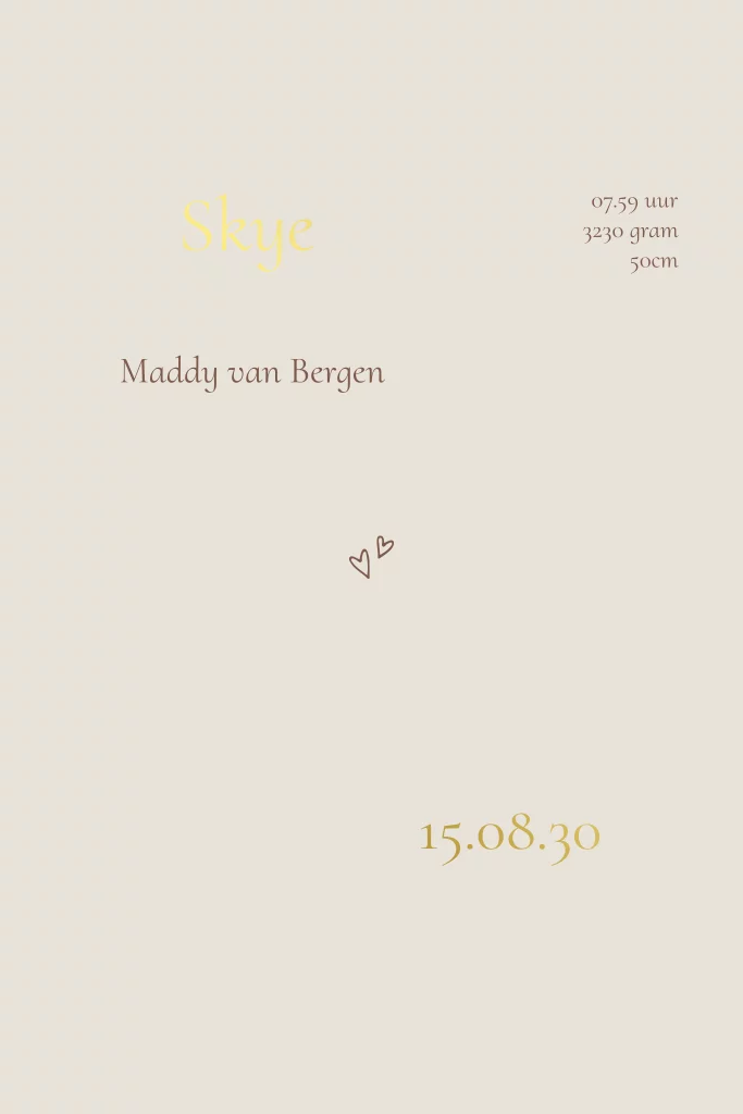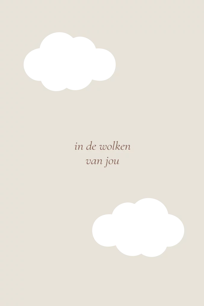 Lief minimalistisch geboortekaartje in beige met twee uitgesneden wolkjes - doorkijkjes en goudfolie naam en datum.