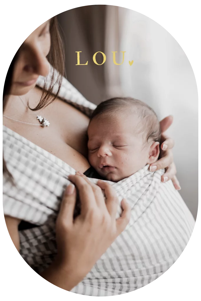 Ovaal geboortekaartje met een foto van bijvoorbeeld je newbornshoot en de naam en hartje in goudfolie. Hulp nodig met opmaken van jouw geboortekaartje? Wij helpen je graag!