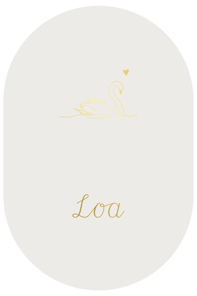 Lief en minimalistisch ovaal geboortekaartje met een lijntekening van een zwaan. De zwaan, hartje en 'zo geliefd' worden gedrukt in goudfolie.