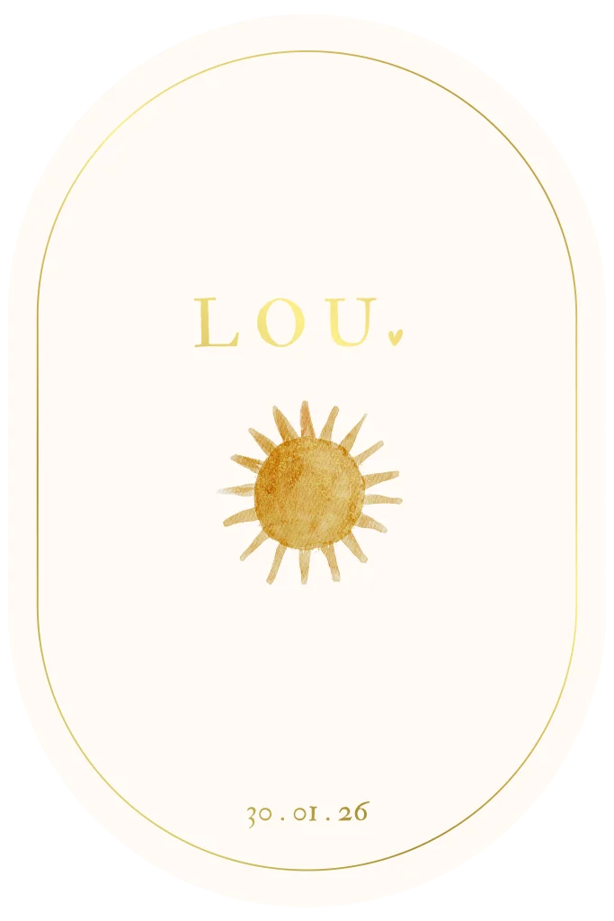 Ovaal geboortekaartje met aquarel watercolor zon met goudfolie rand en de zonglinstering in folie. Hulp nodig met opmaken van jouw geboortekaartje? Wij helpen je graag!