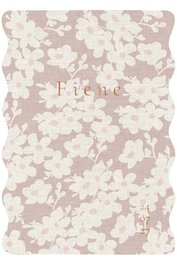 Een geboortekaartje in een unieke vorm met golven aan de zijkant. De achtergrond bestaat uit mooie wilde bloemen. De geboortedatum en naam, hier verticaal geschreven, worden gedrukt in koperfolie.