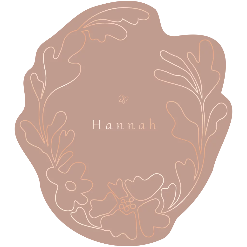 Unieke vorm (stanskaart) geboortekaartje met een mooie bloemenboog in oudroze. De lijnen om de bloemenboog, het vlindertje en babynaam worden gedrukt in folie.