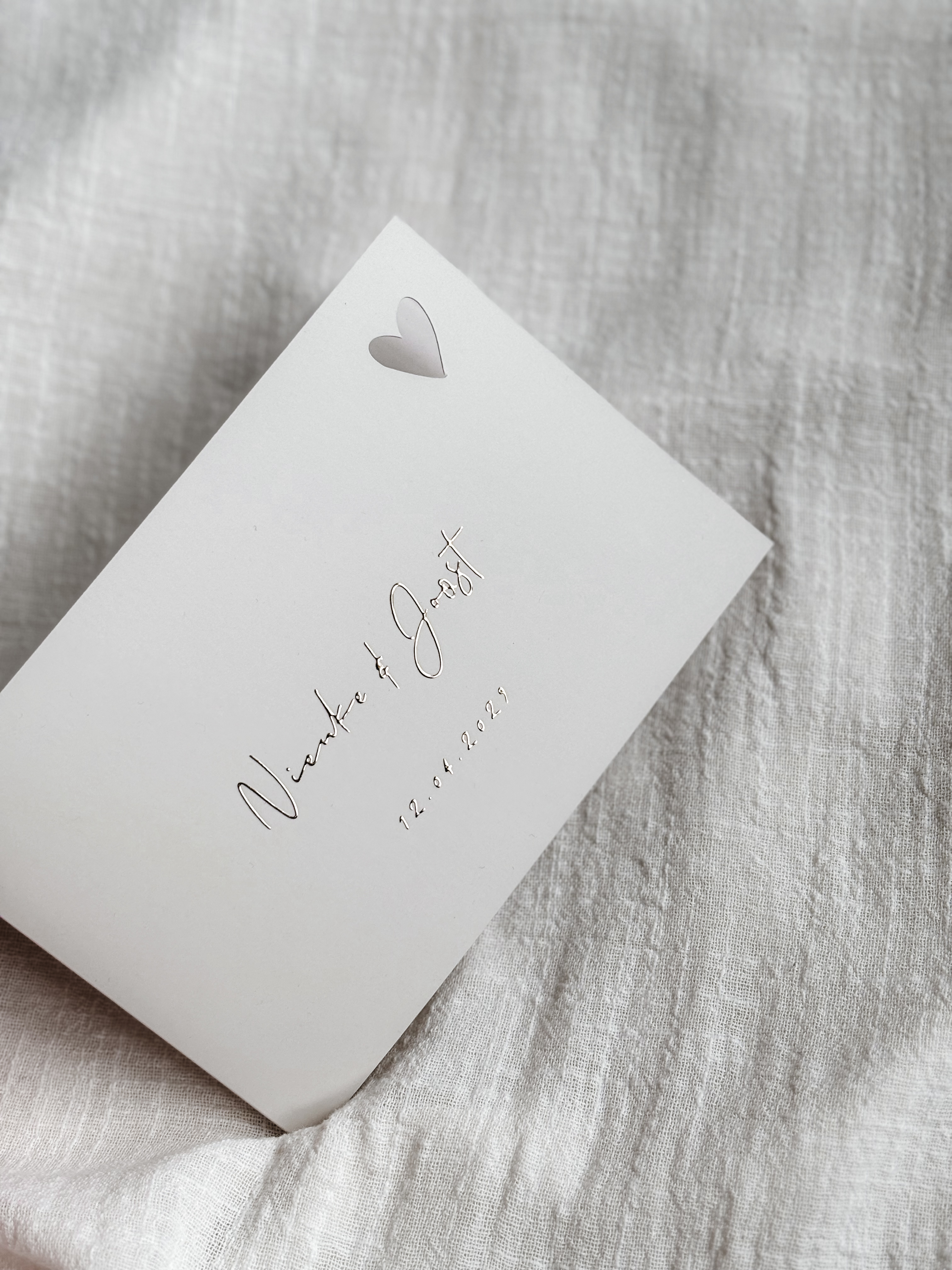 Ga voor deze mooie chique beige trouwkaart, met als mooi detail een hartuitsnede. Tip: druk deze kaart af op mat coated papier voor een zachte maar strakke look. Hulp nodig? Wij helpen je graag!