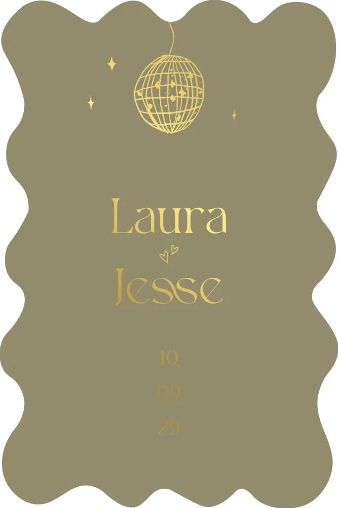 Trouwkaart vorm golf modern handgetekend discobal speels goudfolie