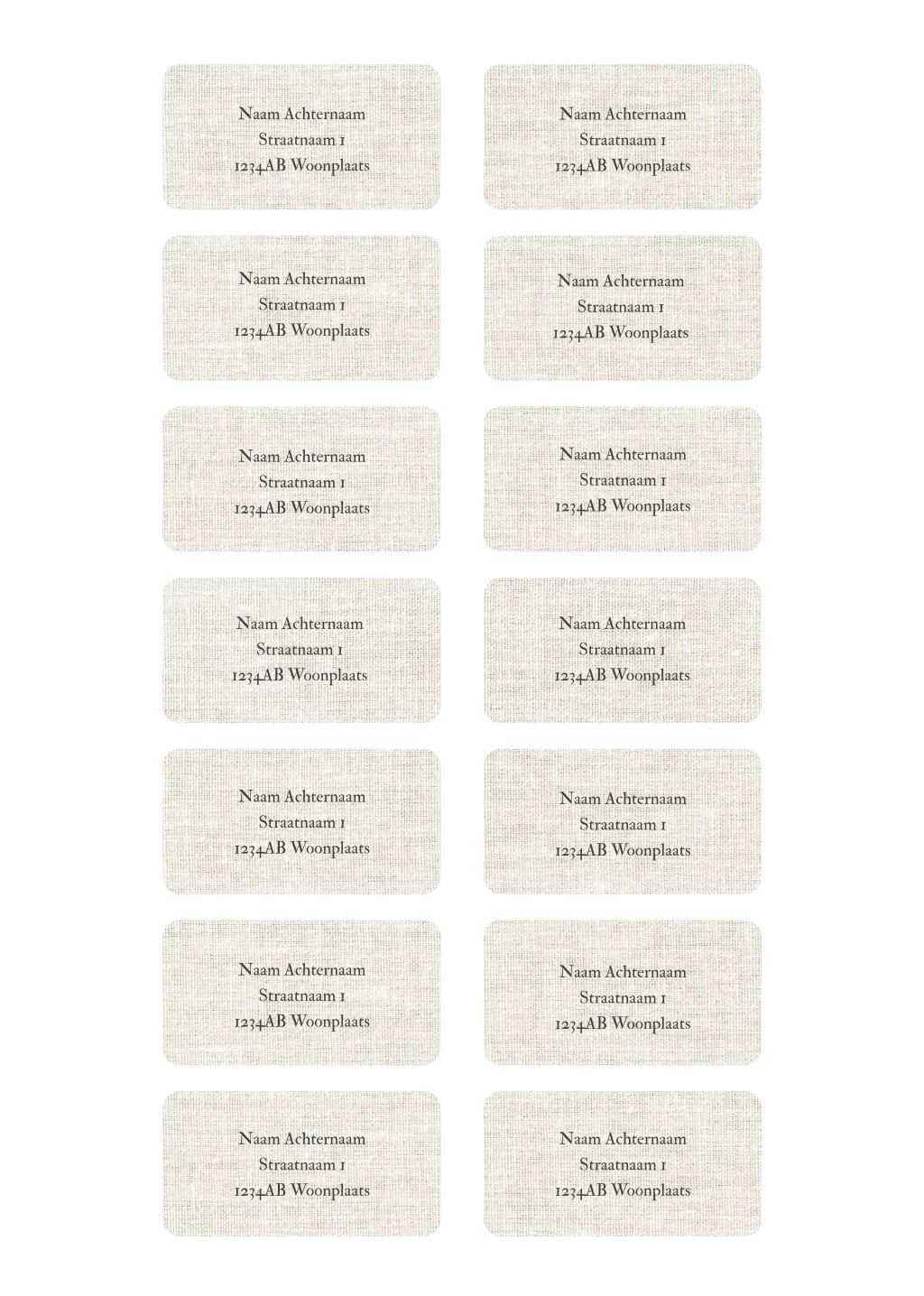 Bestel deze adresstickers in de stijl met je geboortekaartje. Handig om van tevoren de adressen erop te zetten. Hoe werkt het? Dit vel vol? Kopieer dit bestand dan in je collectie en maak de volgende 14 adressen compleet. Je dient elk vel gewoon 1 keer in je winkelwagentje te stoppen. Voor hulp of vragen: wij helpen je graag!