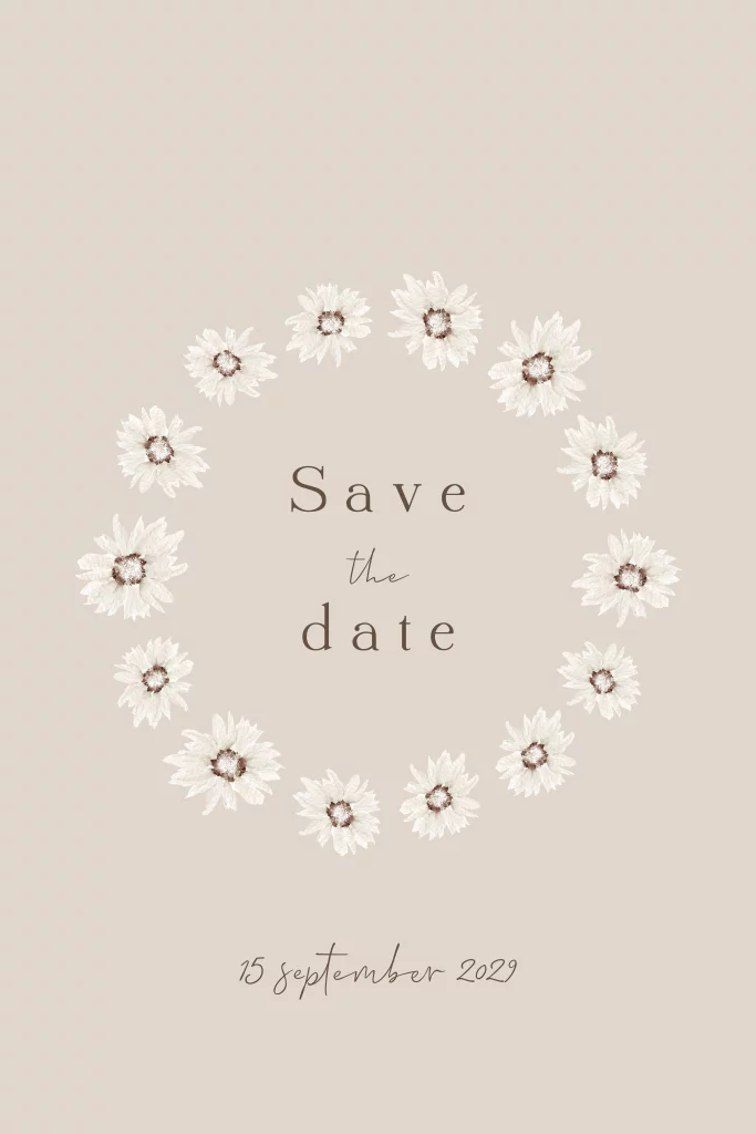 Chique save the date kaart in beige met witte madeliefjes in een ronde met goudfolie knopjes. Pas jullie save-the-date kaart helemaal naar wens en smaak aan in de editor. Mocht je hulp nodig hebben, wij helpen je graag! TIP: kies uit de collectie trouwkaarten voor de bijpassende officiele uitnodiging!