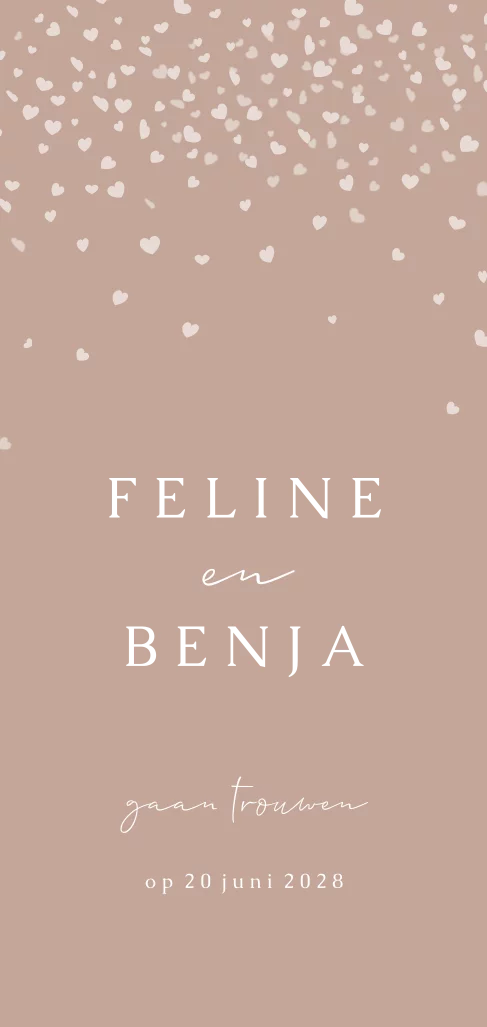 Langwerpige trouwkaart in beige met witte hartjes confetti en namen in goudfolie gedrukt. Stel je trouwkaart helemaal naar wens samen in de handige editor. Heb je hulp nodig? Wij helpen je graag!