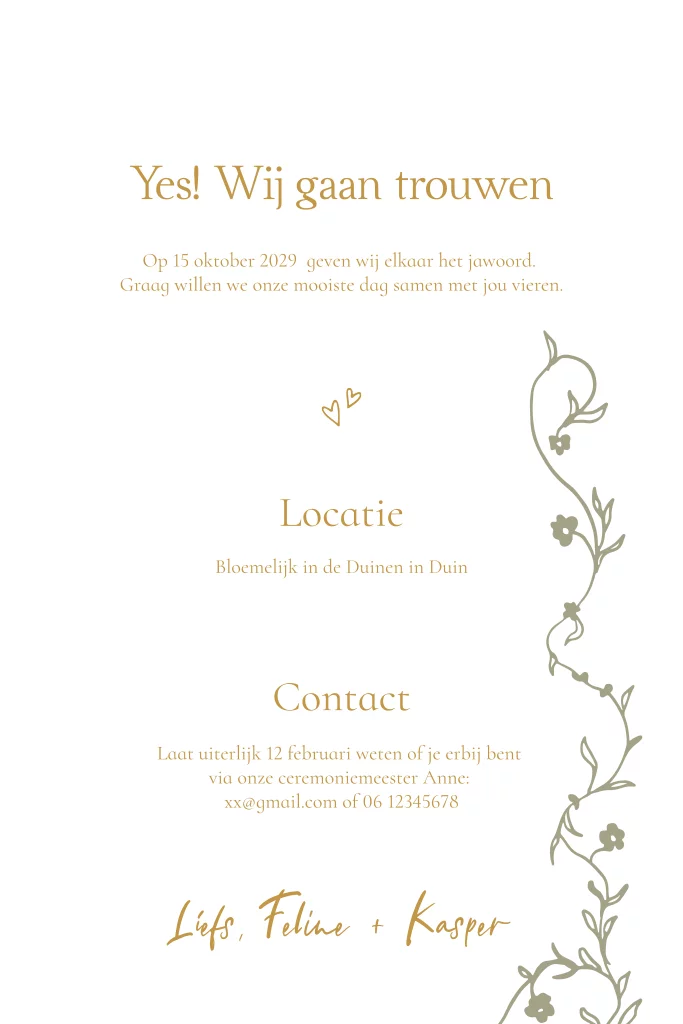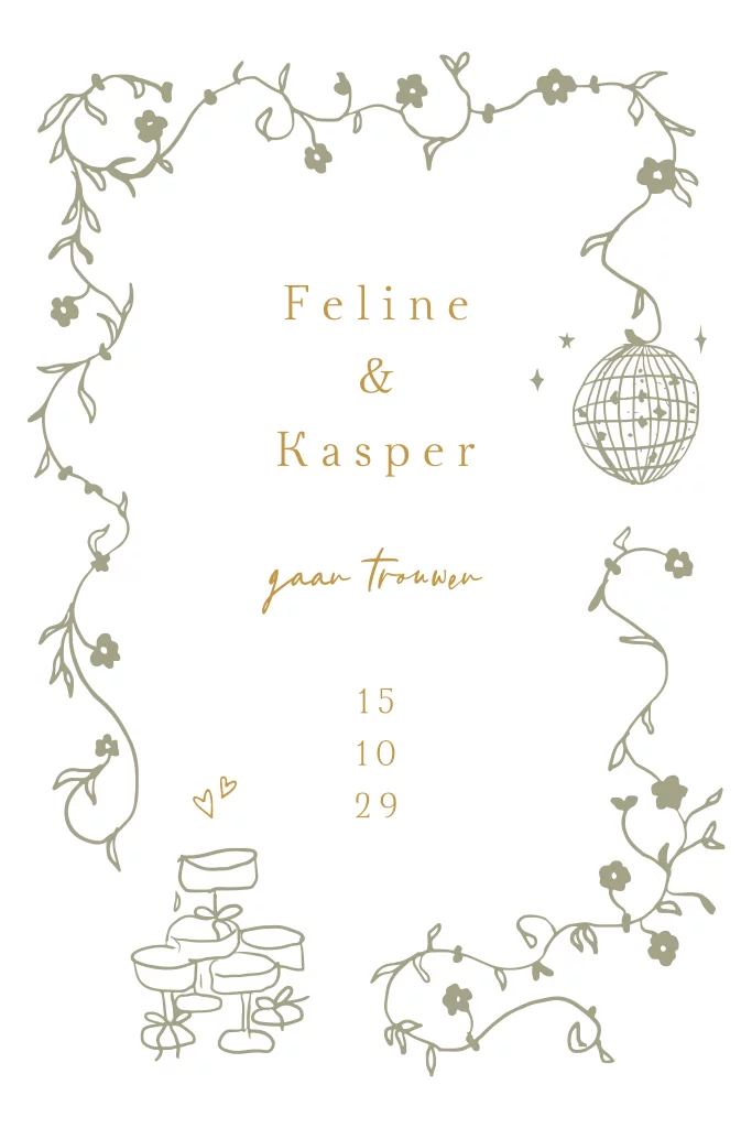 Superoriginele trouwkaart in een dubbele staande kaart met een speels karakter. De illustraties zijn handgetekend. Hulp nodig met opmaak of bijpassende save the date kaart en sluitzegels? Vraag om hulp als je er niet uitkomt!